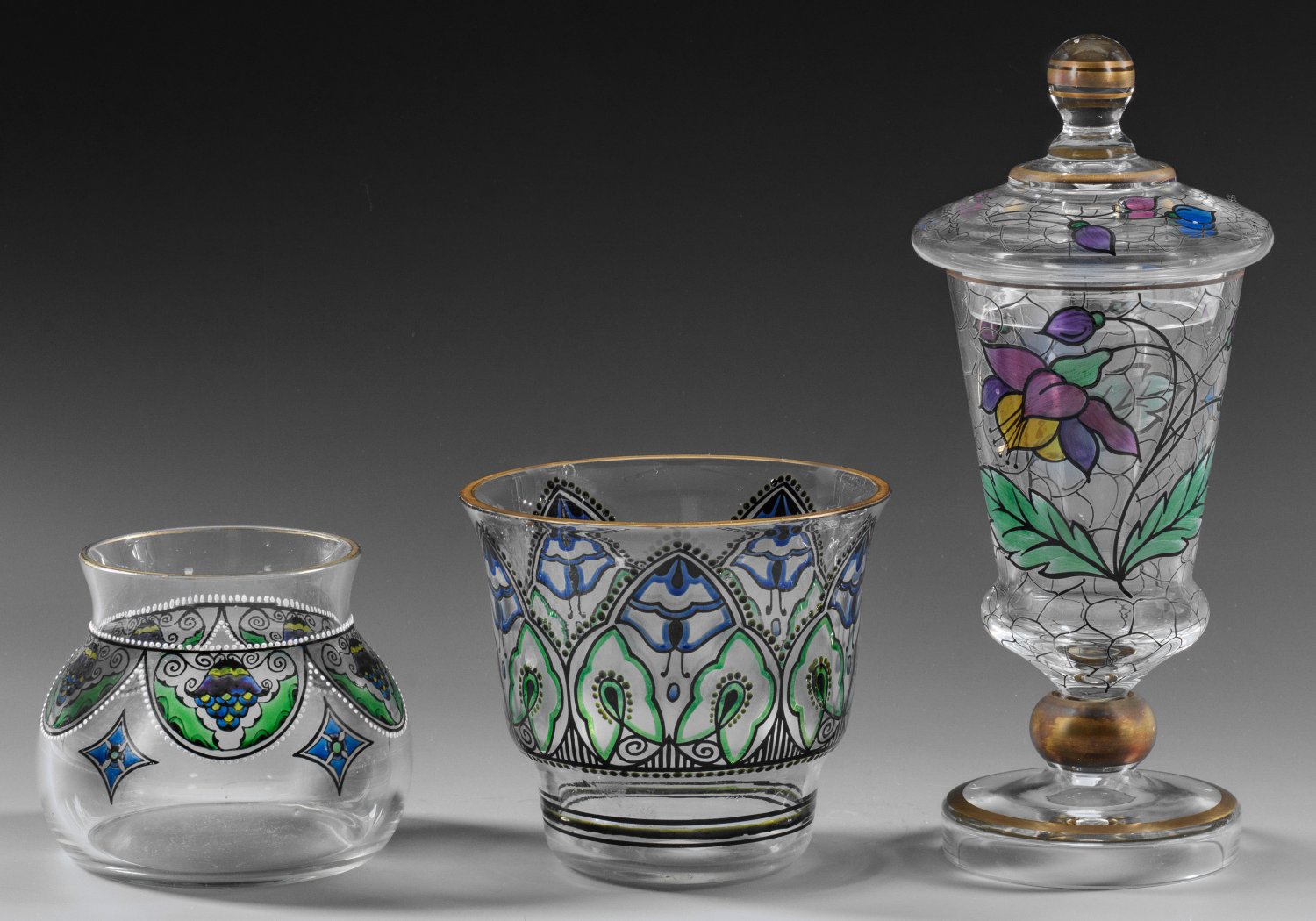 Farbloses Glas. Unterschiedliche florale und ornamentale Dekore in polychromer Emailmalerei, Schwarz und Gold. H. 8,5 cm-23 cm.