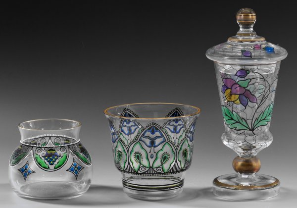 A collection of three Bohemian glass objects manufactured in Haida (Nový Bor) or Steinschönau (Kamenický Senov).