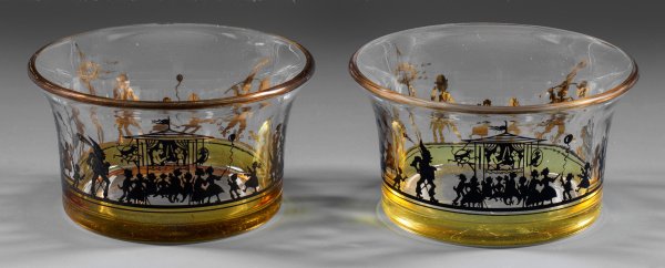 Farbloses Glas, Boden und Rand geschliffen. Weite Glockenform. Silbergelb gebeizter Fuß. Schwarz gemalter Silhouettendekor aus einer Jahrmarktsszene mit Kasperletheater. H. 5,8 cm; D. 11,2 cm.