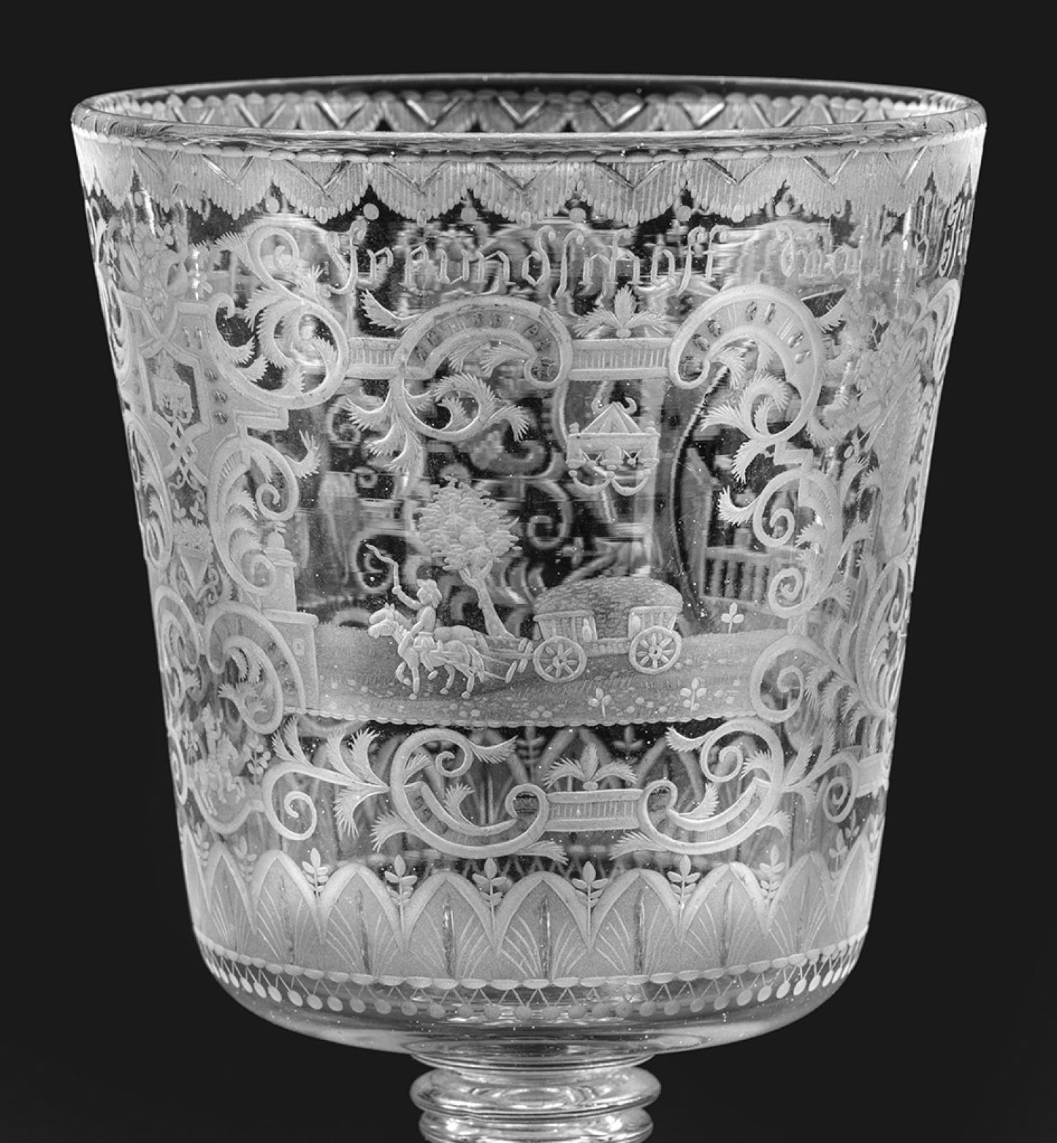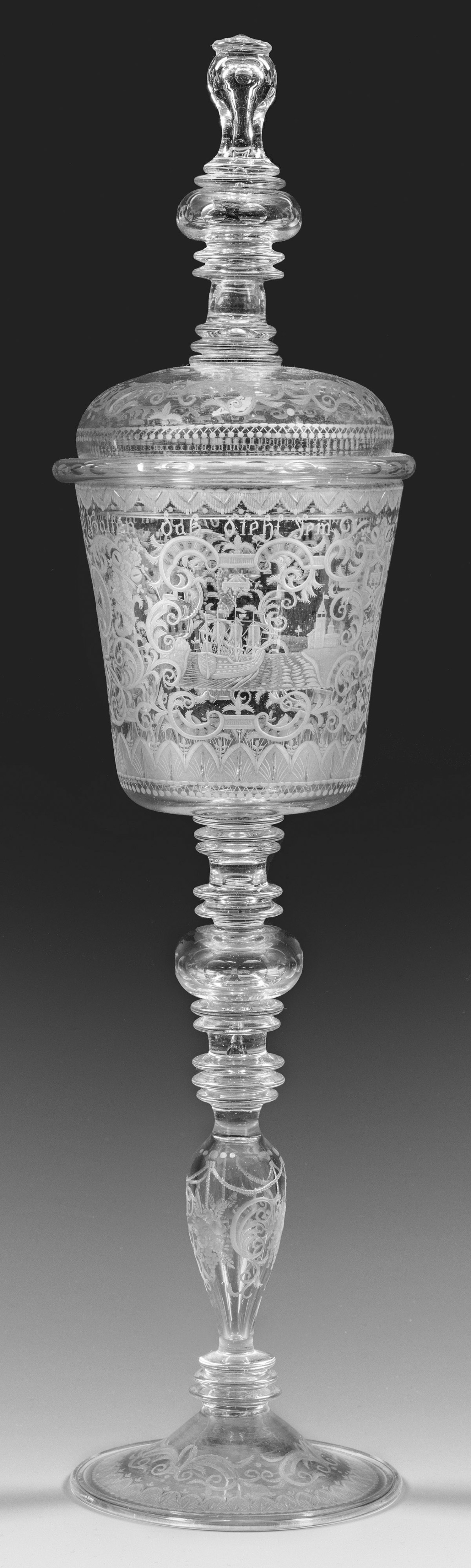 Farbloses Glas. Mittig konisch ansteigender Fuß mit umgeschlagenem Schaft, reich gegliederter Hohlbalusterschaft, angesetzte, konische Kuppa. Gewölbter Haubendeckel, zum Schaft korrespondierend gestalteter, hoher Knauf. Teilw. geblänkter, geschnittener Dekor. Auf der Kuppa in zwei Bildfeldern und einem Rundmedaillon ein beladener Pferdewagen, ein einlaufendes Segelschiff im Hafen sowie emblematisch ein Herzenpaar in Kombination mit einem Taubenpaar und Freundschaftshänden unter einer Krone. Oberhalb Inschrift mit korrespondierendem Sinnspruch "Freundschaftz snarhen Ist Gemein (/) Freundschaft halten daß ist fein". Als Umrahmung flächendeckender, ornamentaler Dekor aus Laub- und Bandelwerk mit Füllhörnen, bereichert um Baldachinmotive und einen Reiter, unterhalb und am Lippenrand umlaufende Bordüren. Auf Fuß, Schaft und Deckel dezenter Olivenschliffdekor sowie Bandelwerk und Früchtefestons in Mattschnitt. H. 43 cm.