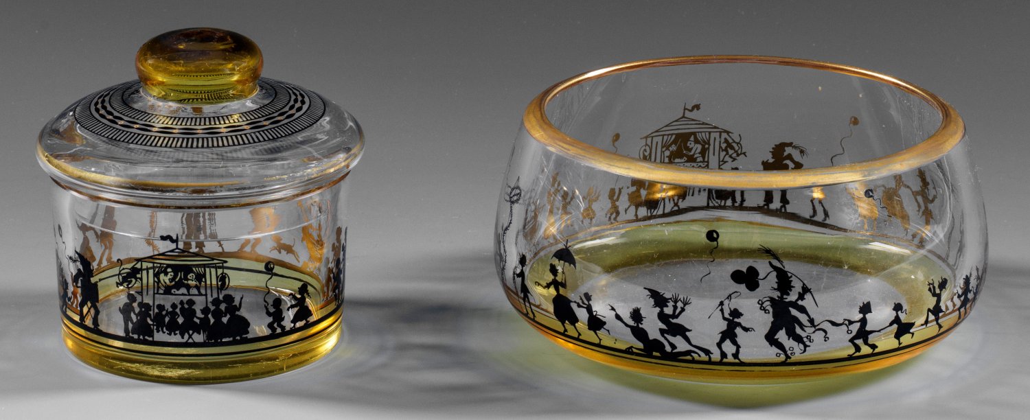 Farbloses Glas, Boden und Rand geschliffen. Silbergelb gebeizter Fuß und Knauf. Schwarz gemalter Silhouettendekor mit Jahrmarktsszene mit Kasperletheater, goldgerändert, auf dem Deckel ein ornamentaler Fries. H. 6 cm-8 cm; D. 8,5 cm-13 cm.