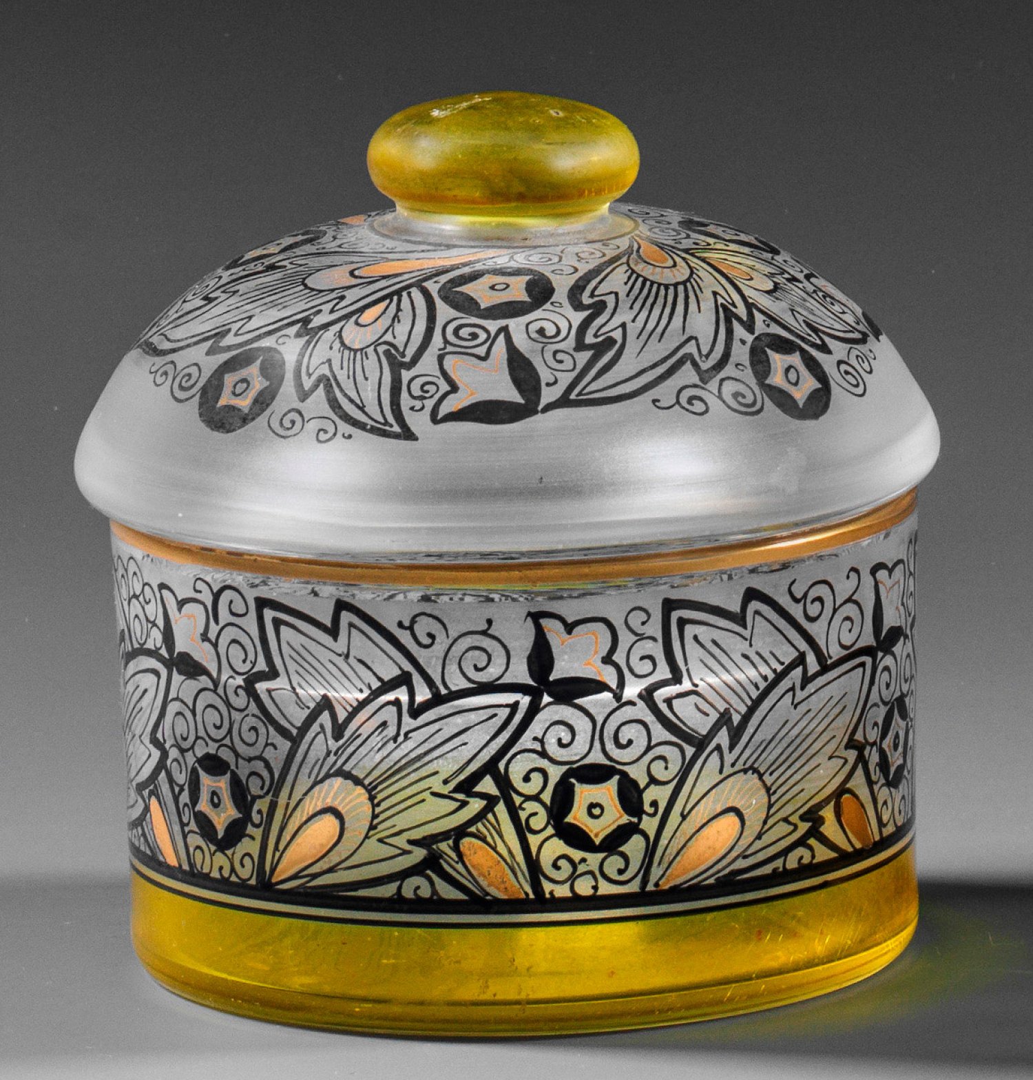 Annähernd zylindrisches Unterteil, kugelig gewölbter Deckel mit gedrückt-kugeligem Knauf. Farbloses Glas, teilw. silbergelb gebeizt und mit Mattsalz behandelt. Ornamentaler Dekor in Schwarz und Gold. Entw. Adolf Beckert, Glasfachschule Steinschönau, um 1915-1920. H. 9 cm.