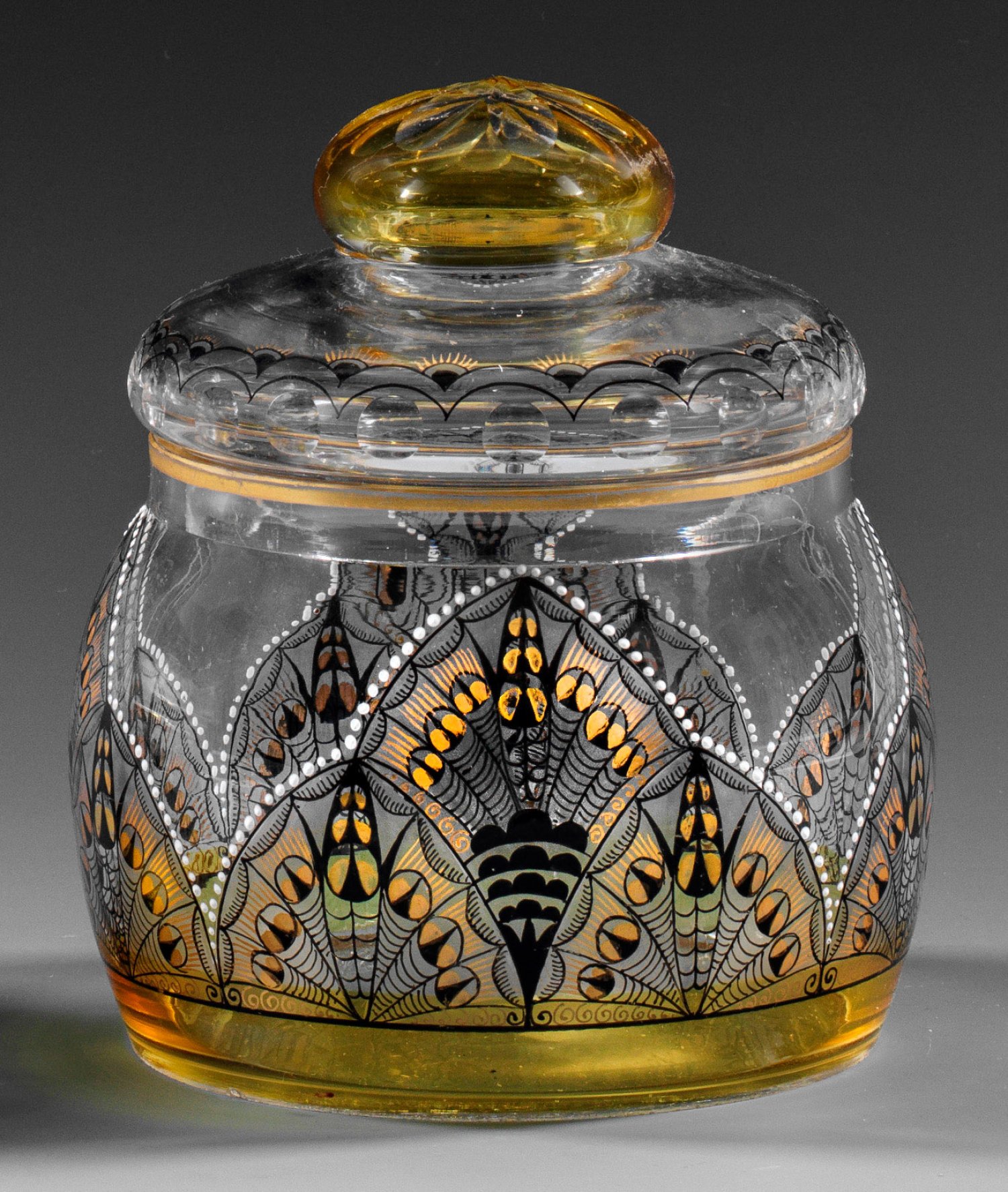 A Bohemian glass box and cover designed by Adolf Beckert. Manufactured by the Glasfachschule and Glasmanufaktur Friedrich Pietsch in Steinschönau (Kamenický Senov).