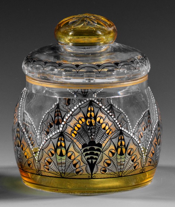 Farbloses Glas, Boden und Rand geschliffen, silbergelb gebeizter Fuß und Knauf. Ornamentaler Dekor in Schwarz und Gold sowie kombiniert mit weißen Emailpunkten. Entw. Adolf Beckert, Glasfachschule Steinschönau, um 1915-1920. H. 12,5 cm.