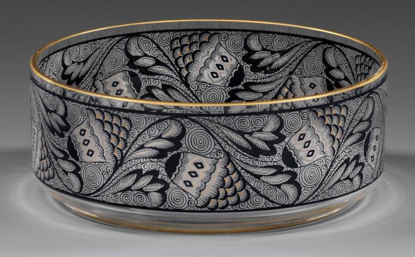 Zylindrisch. Farbloses Glas, ornamentaler Dekor in Schwarz und Gold. Entw. Adolf Beckert, Glasfachschule Steinschönau, um 1915/16. Gemarkt und dat. "19 CL 17". D. 14,2 cm.