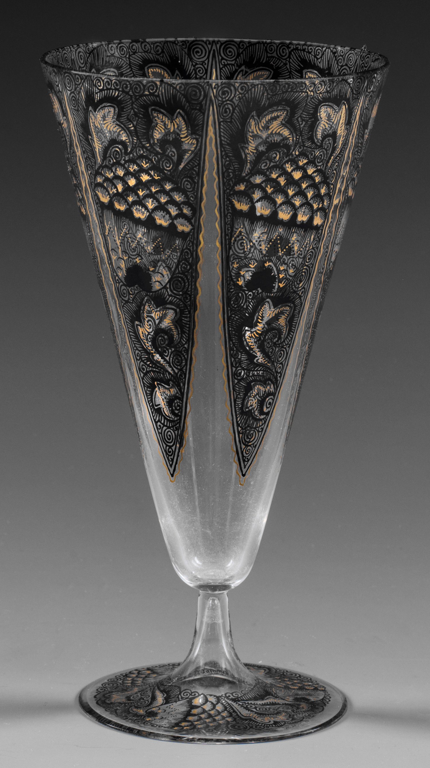 Weit ausgestellter Fuß, in den hohlen Schaft einschwingend, konische Kuppa. Formentwurf Oskar Strnad. Farbloses dünnwandig mundgeblasenes Glas (sog. Musselinglas) mit ornamentaler Schwarzlot- und Goldmalerei in sechsfachem Rapport. Dekorentwurf und -ausführung Karl Massanetz, Steinschönau, für J. & L. Lobmeyr, um 1914. H. 16,7 cm.