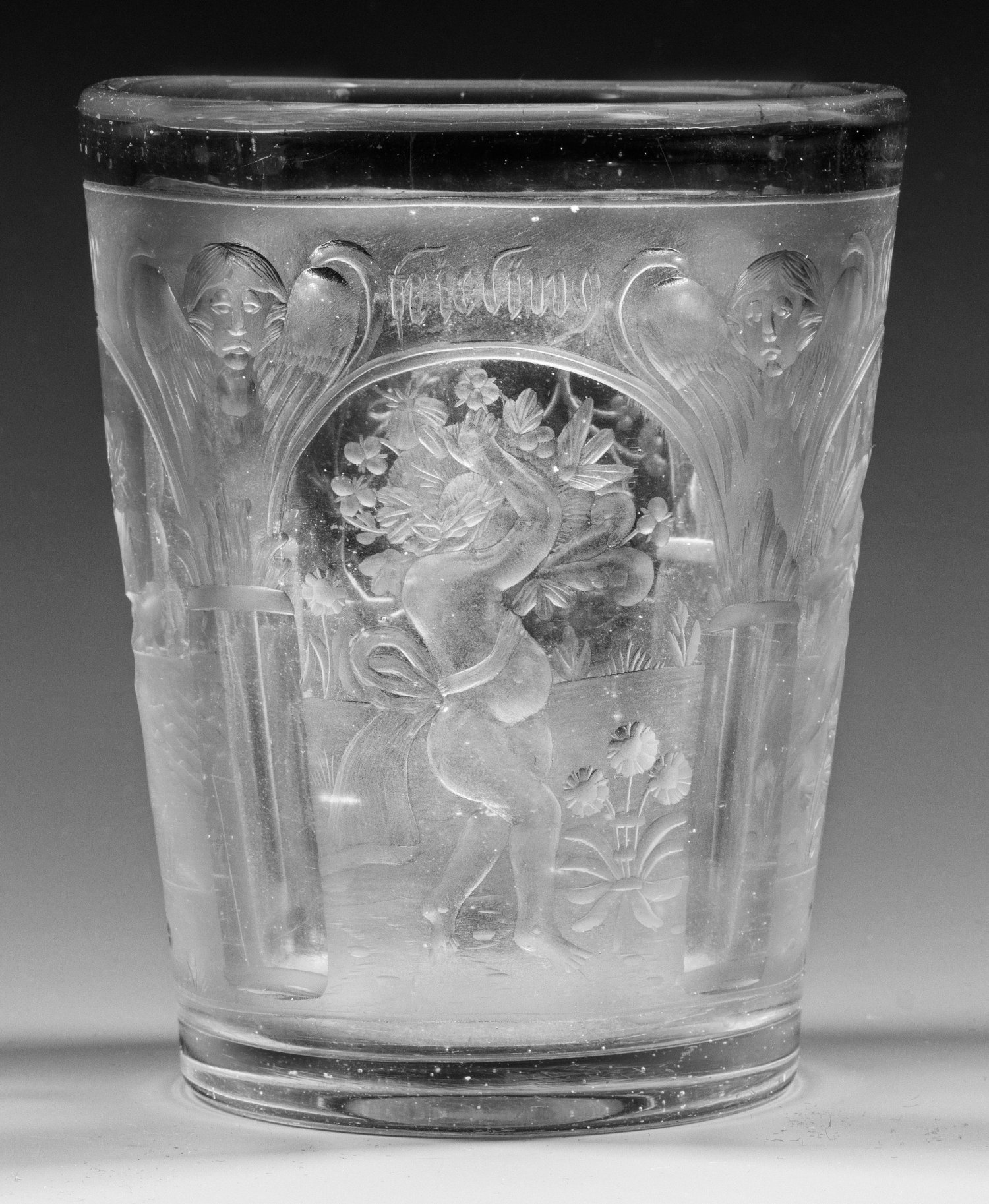 Farbloses Glas. Leicht konische Form. Dekor in partiell geblänktem Tiefschnitt. Wandung umlaufend unterteilt durch Rundbogenarchitektur, in den Zwickeln geflügelte Engelsköpfe. Zwischen Säulen szenische Allegorien der vier Jahreszeiten. Vier Putti mit ihren jeweiligen Attributen Blütenkorb, Ähren, Weinrebe bzw. Brennholz in stilisierter Landschaft, oberhalb inschriftlich bez.; H. 12,5 cm.