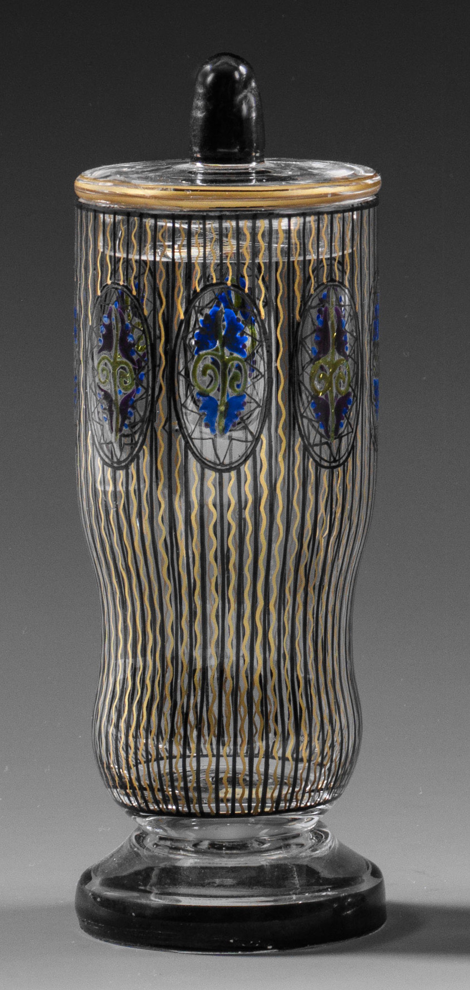 Gefußte Stangenform, flacher Deckel mit eichelförmigem Knauf. Farbloses Glas, Ränder geschliffen. Stilisierter, ornamentaler Dekor in Schwarz, Gold und farbigem Email. H. 15 cm.