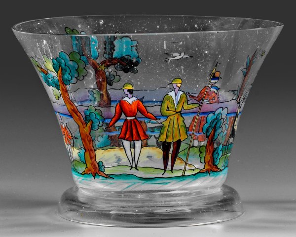 Glockenform auf hochgewölbtem Fuß. Farbloses, leicht blasiges Glas (Rohglas bezogen von Johann Oertel & Co., Haida). Umlaufender, in der Wiener Werkstätte ausgeführter szenischer Dekor aus Figuren und Tieren an einem Seeufer in polychromer Emailmalerei. Formentw. Josef Hoffmann, Dekor-Entw. Hilda Jesser-Schmidt, 1917. Am Boden sign. "WW" (in Ligatur). H. 10,5 cm; D. 15 cm.