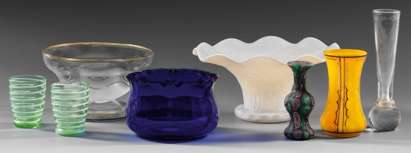 8-tlg.; Farbloses und farbiges Glas in unterschiedlichen Techniken und Dekoren, darunter eine glockenförmige, böhmische Jugendstil-Schale aus irisiertem Glas mit Wabenmuster und eine Murano-Millefiori-Vase von Fratelli Toso. Ein Schnapsbecher minim. best.; H. 5,5 cm-13,8 cm; Schalen-D. 10 cm-16,8 cm.