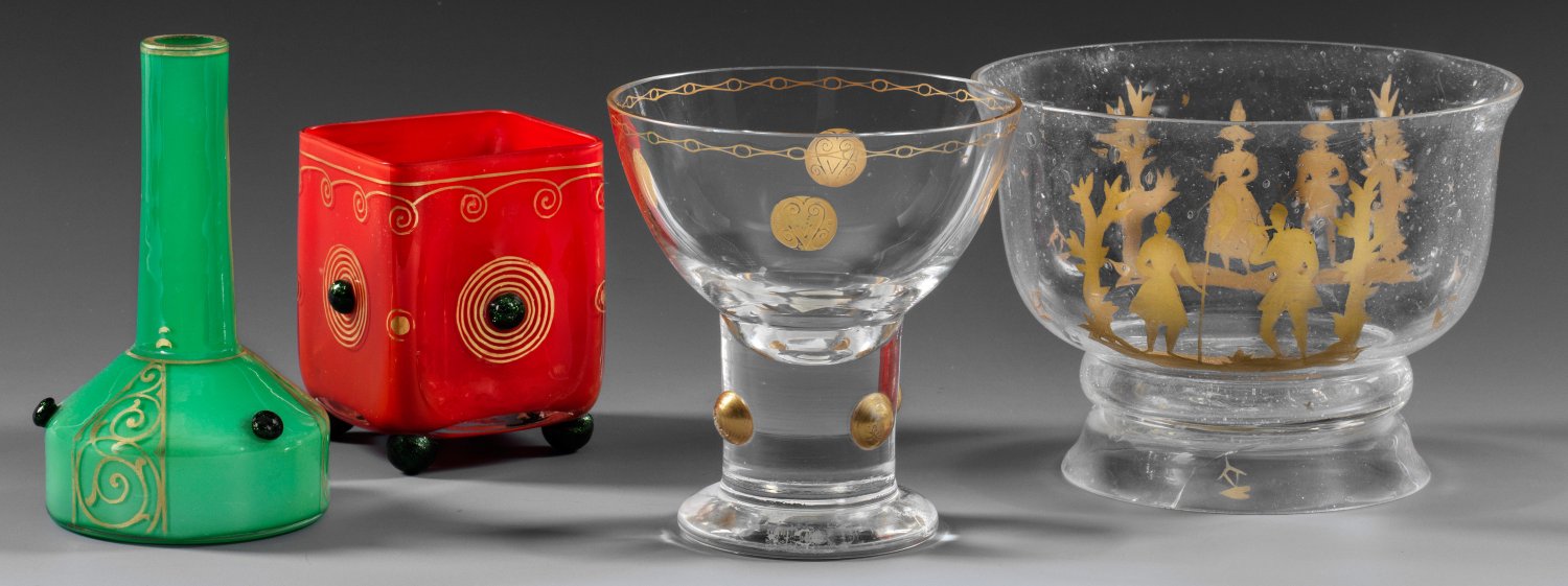 4-tlg.; Fußschale der Wiener Werkstätte mit figürlichem Dekor in Gold (besch.), sign. "WW"; ein Pokal mit vier aufgesetzten Nuppen und Golddekor, Entw. Georg Carl von Reichenbach, um 1906, für Poschinger; eine Enghalsvase und ein sog. "Zigarettenkasten" mit Nuppen- und Golddekor, Entw. Jean Beck für Regenhütte oder Cristallerie Wadgassen. H. 8 cm-10,5 cm; Schalen-D. 13,7 cm.