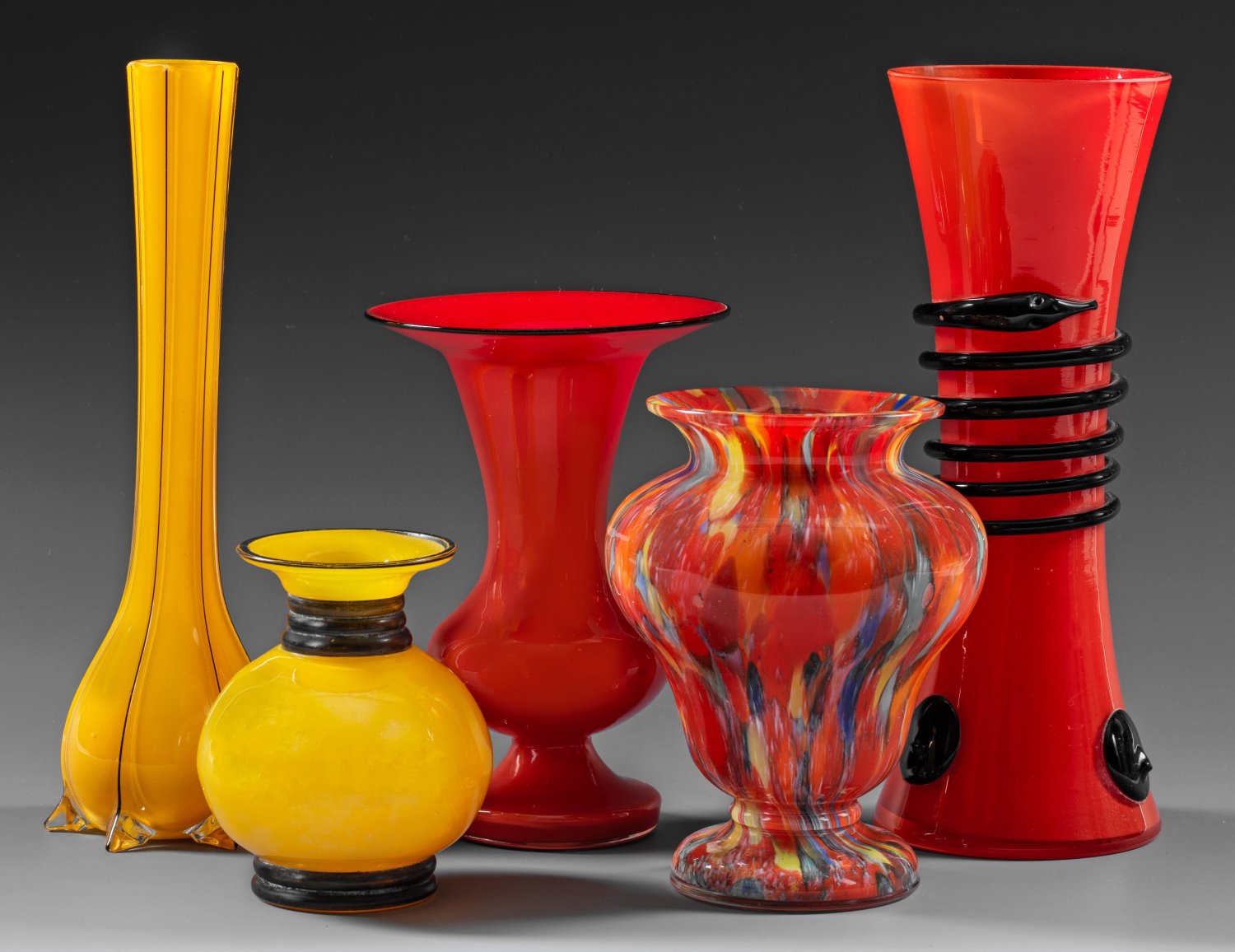 5-tlg.; Überfangglas, farblos, rot, gelb und mit polychromen Einschmelzungen. Darunter eine Stangenvase und eine Balustervase in sog. "Tangofarben" mit Lippenrand, Nuppen und Schlangenauflage aus schwarzem Glas; eine Vase mit Kugelbauch und schwarzem Ringdekor, Entw. Jean Beck, gemarkt. H. 10,5 cm-24,8 cm.