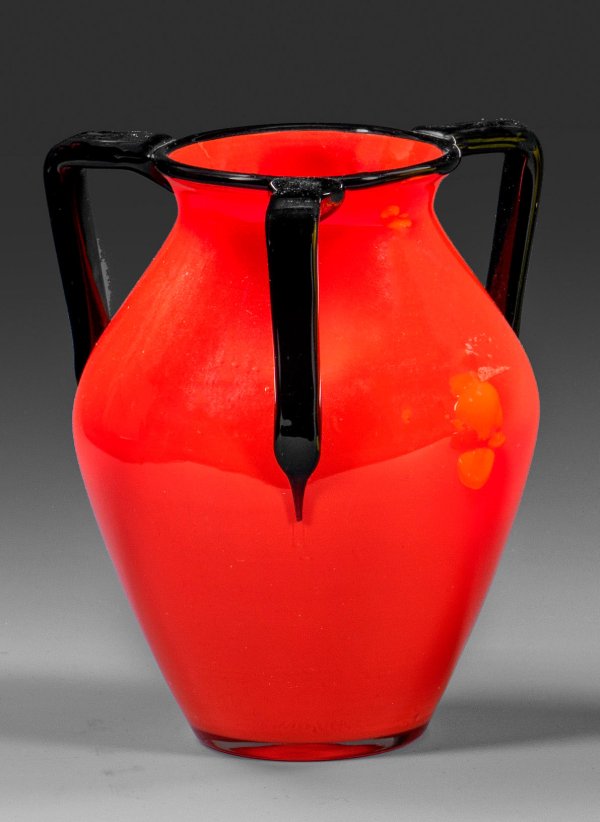 Dekor in "Tango-Farben" aus leuchtend rotem, farblos überfangenem und schwarzem Glas. H. 14 cm.