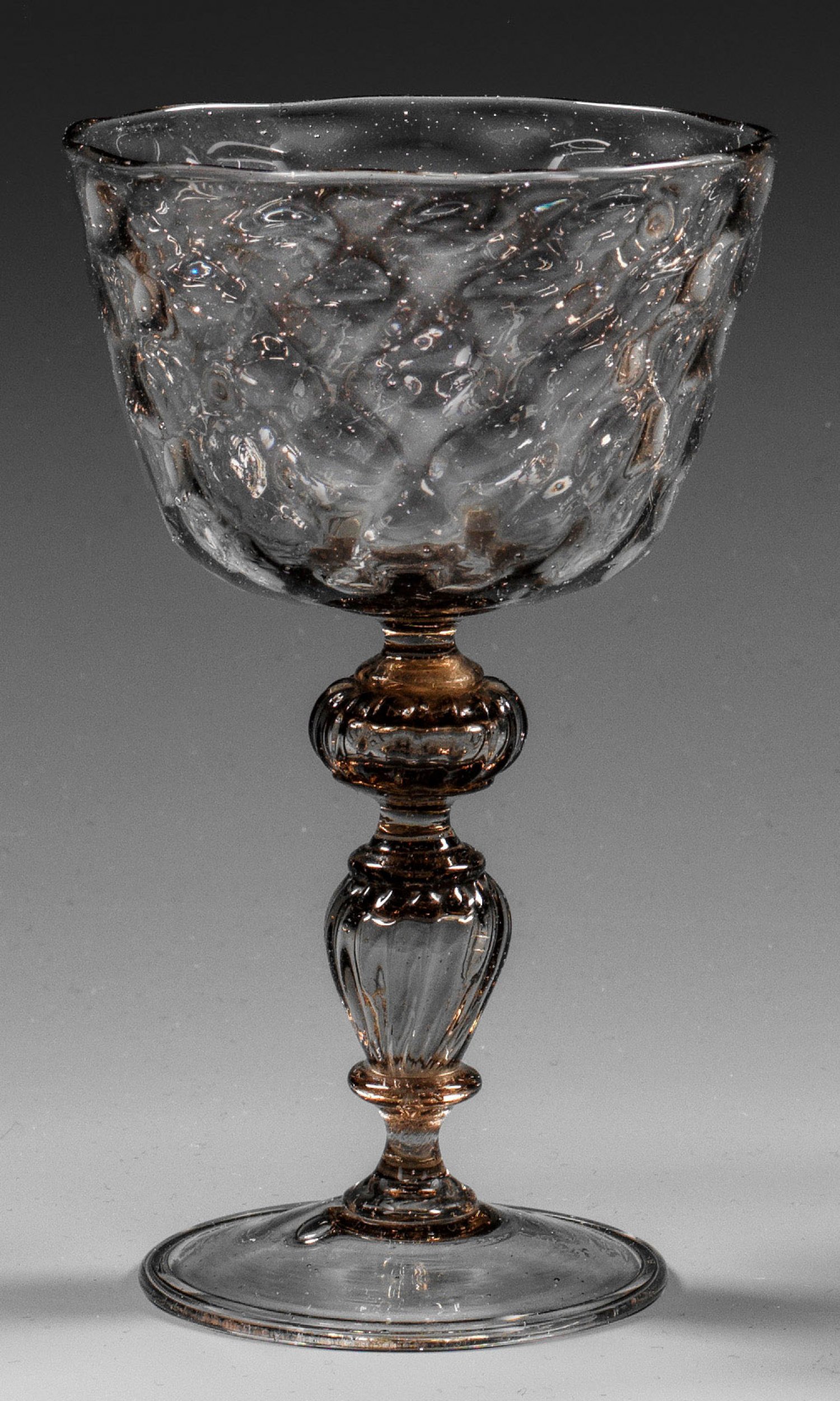 Rauchfarbenes Glas. Leicht ansteigender, kleiner Scheibenfuß, umgeschlagener Rand, reich gegliederter, gerippter Hohlbalusterschaft, die abgesetzte, konische Kuppa mit optischem Wabenmuster. H. 11,8 cm.