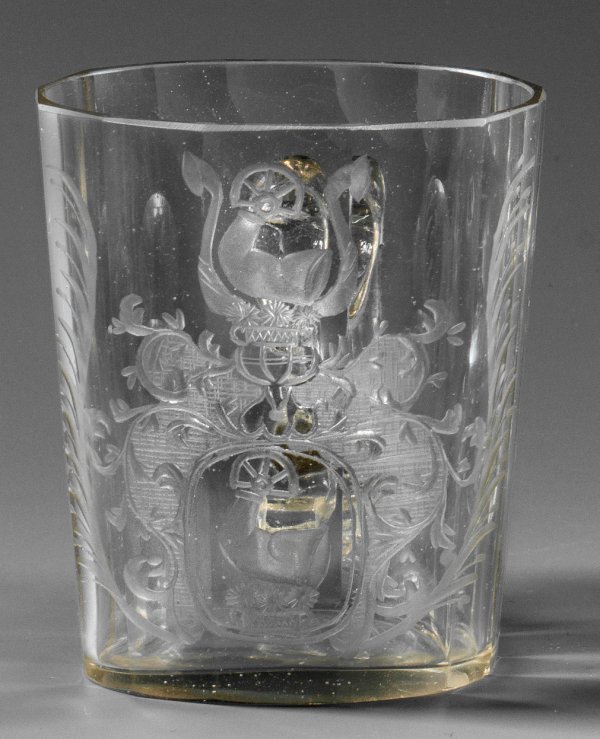 A Silesian armorial glass beaker with handled cut and engraved decor.