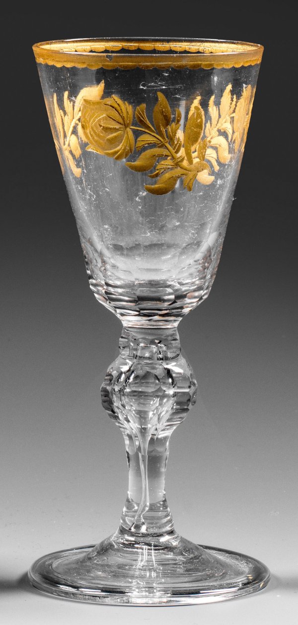 Farbloses Glas, geschliffen. Leicht ansteigender Scheibenfuß mit umgeschlagenem Rand, der Balusterschaft mit eingestochener Luftblase und Ansatz der konischen Kuppa wabenfacettiert. Geschnittener, vergoldeter Dekor. H. 14,8 cm.