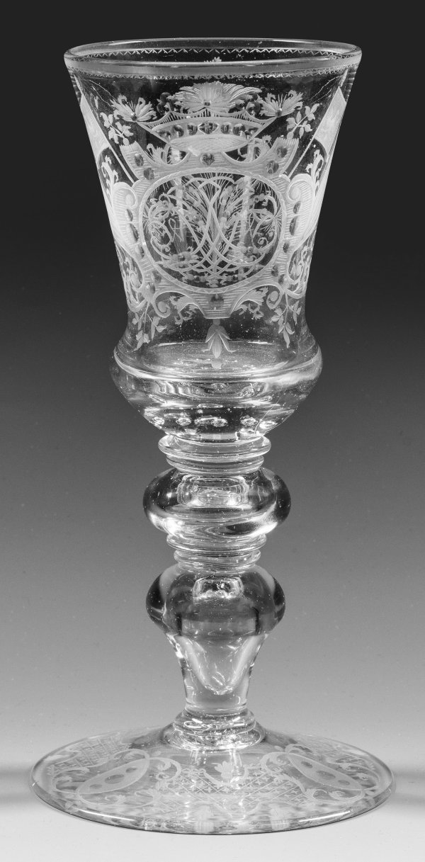 Farbloses Glas, Schliff- und Mattschnittdekor mit Blankperlen. Auf dem Fuß Bandelwerk- und Netzornamentbordüre. Teilw. hohler Balusterschaft, im Ansatz der glockenförmigen Kuppa neun kleine eingestochene Luftblasen. Schauseitig kartuschengerahmtes und bekröntes Spiegel-Monogr. "JLW", flankiert von zwei Fahnen mit brandenburgischem bzw. sächsischem Adler. Rücks. stilisierte Nelke. H. 24,5 cm.