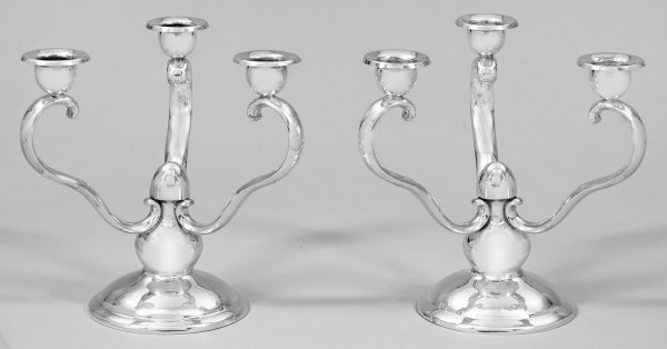 A pair of three-light silver candlesticks by jeweller Watty. Standard mark 835.