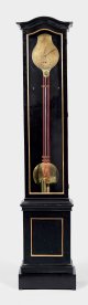 Holz, ebonisiert und teilw. vergoldet. Über hohem gekanteten und in der Front kassettierten Sockel flacher, dreiseitig teilw. sprossenverglaster Korpus mit geschweift ansteigendem Profilabschluss. Tropfenförmiges Messingzifferblatt mit Stundenskala aus römischen Ziffern, großer zentraler Minuterie und kleiner Sekunde, bez. F.A.Görke in Görlitz. Gebläute Zeiger. 8 Tage-Messingwerk mit Ankerhemmung und Federaufhängung für Kompensationspendel sowie Gewichtstantrieb nach Huygens mit vorneliegender Schnurrolle. Rest.; H. 197 cm.