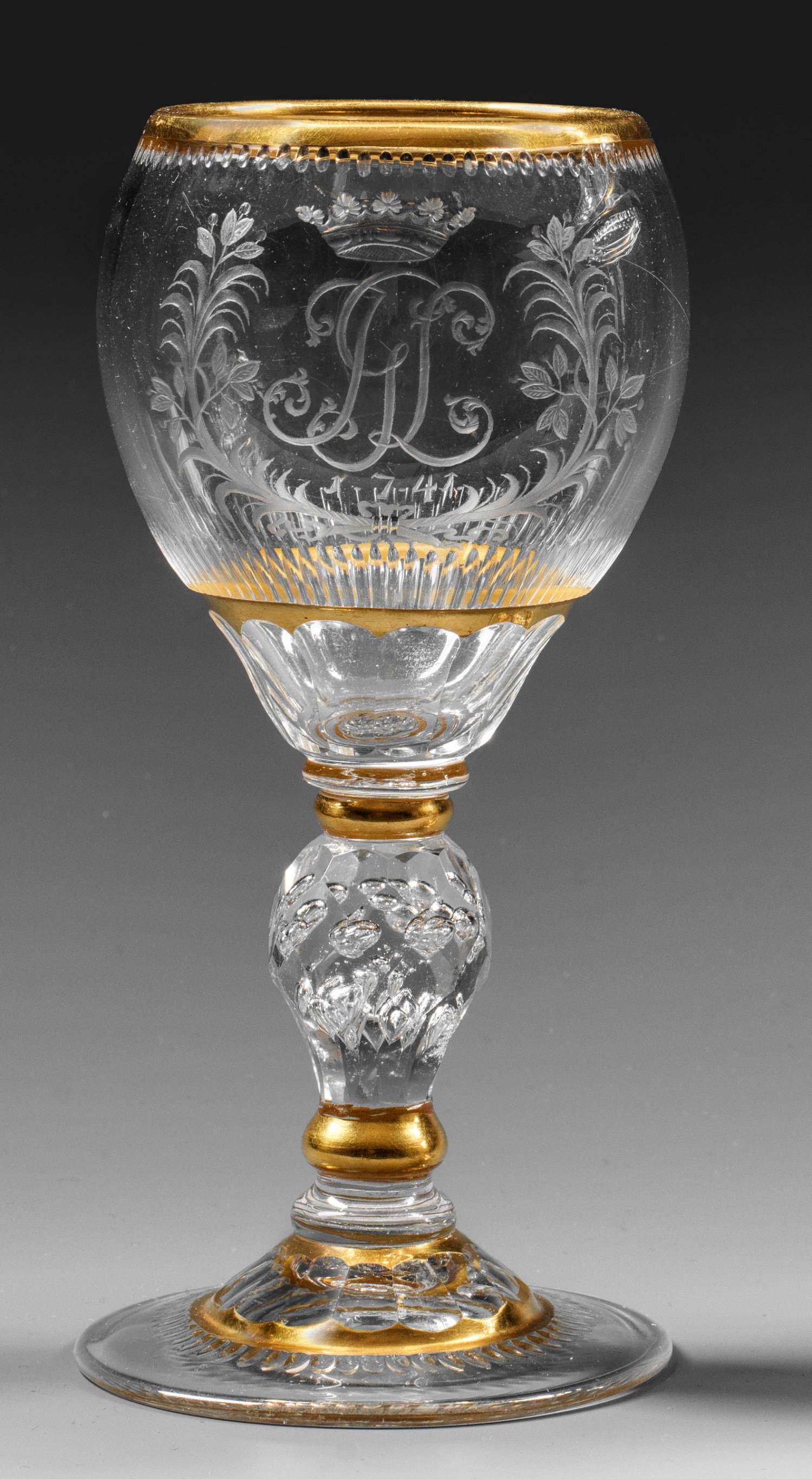 Farbloses Glas, geschnitten und graviert. Römerform. Leicht glockenförmig hochgezogener, durch Zungen- und Olivenschliff verzierter Fuß; facettierter Balusterschaft mit kleinen, eingestochenen Luftblasen; abgesetzte, ovoide, dem Fuß entsprechend dekorierte Kuppa, schauseitig ein bekröntes, von Zweigen umrahmtes Monogramm "JGS" mit Dat. "1741" in Mattschnitt kombiniert mit kleinen Blankperlen und -oliven; vergoldeter Lippenrand mit Perlfries. H. 23,7 cm.