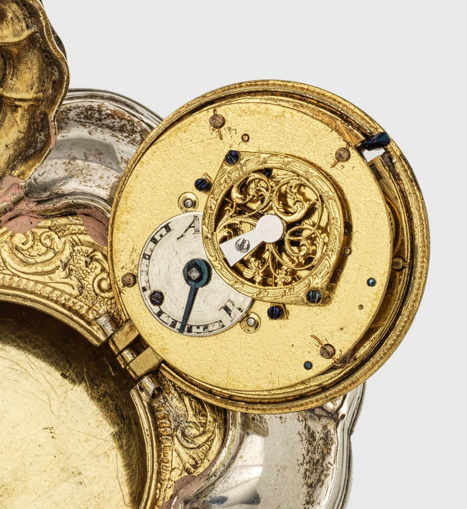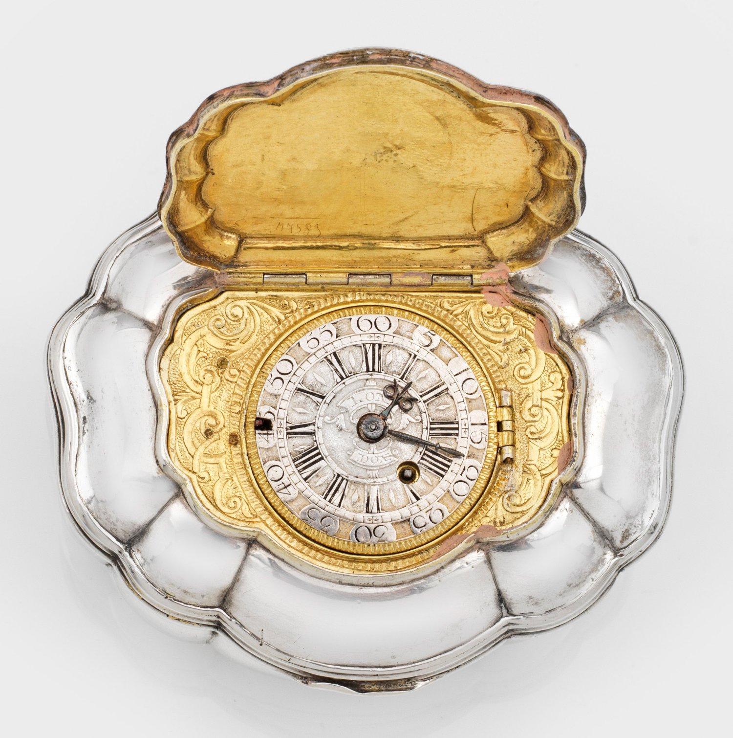 Augsburg/Friedberg. Um 1740. Silber. Geschweifter, passiger Korpus mit gegrateter, getreppter und profilierter Wandung und doppelt scharniertem Deckel. Innenvergoldung. Unter dem oberen Deckel auf fein punziertem und graviertem Grund mit Bandelwerk die versteckt eingearbeitete Spindeltaschenuhr. Champléve-Zifferblatt mit römischen Stunden und arabischer Minuterie, "Beetle and Poker"-Zeigern sowie mit zentraler Ortsbez. "London". Vergoldetes Vollplatinenwerk mit dreiarmiger Messingunruh unter vegetabil gearbeiteter Unruhbrücke in Ajour, Kette und Schnecke. Ges.-Gew. ca. 134,38 g. H. 3,5 cm. 8 x 6,5 cm. D. ca. 31 mm (Uhr).