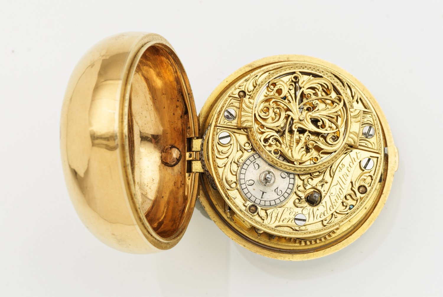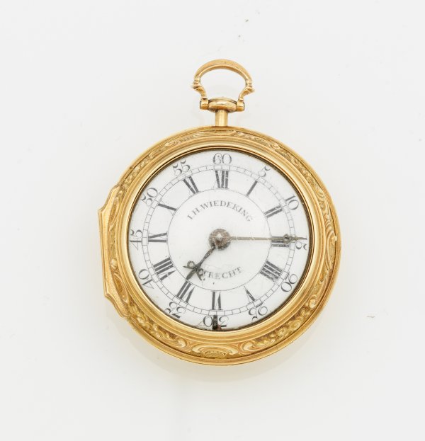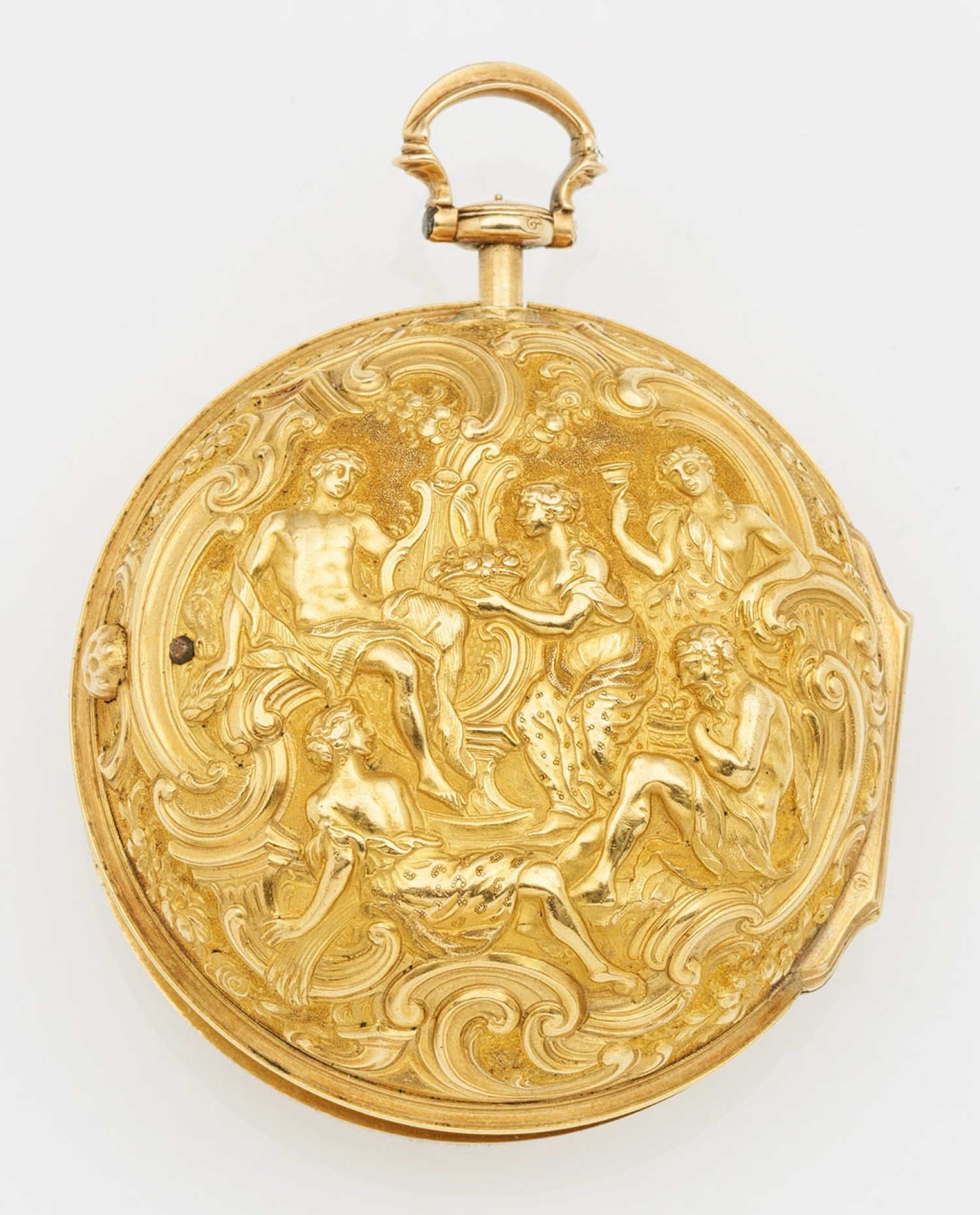 London und Utrecht. Um 1759. 18 und 21 ct. Gold, gest. schreitender Löwe mit Stadtbeschau von London, Jahresbuchstabe für 1759 und Meisterpunze des Gehäusemachers L.M.; Übergehäuse mit aufwendig getriebener und gravierter Szene: im Zentrum der Sonnengott Apoll, hofiert von den personifizierten Jahreszeiten und umrahmt von Voluten, Schwüngen, Muschelwerk und floralen Elementen. Glattes Innengehäuse. Weißes Emailzifferblatt mit römischen Stunden und arabischen Minuten, gebläuten "Poker & Beetle"-Zeigern und Herstellersignet. Feuervergoldetes Vollplatinenwerk mit Schlüsselaufzug, Kette, Schnecke, dreiarmige Stahlunruh und floral dekorierte Unruhbrücke. Platine sign. und num. 45. Schließe des Übergehäuses def.; Gew. ca. 114 g. D. ca. 50 mm.