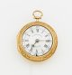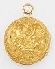 A decorative pair-cased verge pocket watch with "repoussé" decoration "Apollo and the Four Seasons". Gold cases. Inner case marked with maker's mark LM. Enamel dial with "Poker & Beetle" hands and maker's signature. Fire-gilt full plate movement with keywind, chain and fusee. Signed and numbered "45". Opener of the outer case defect.