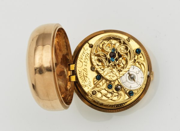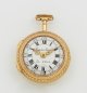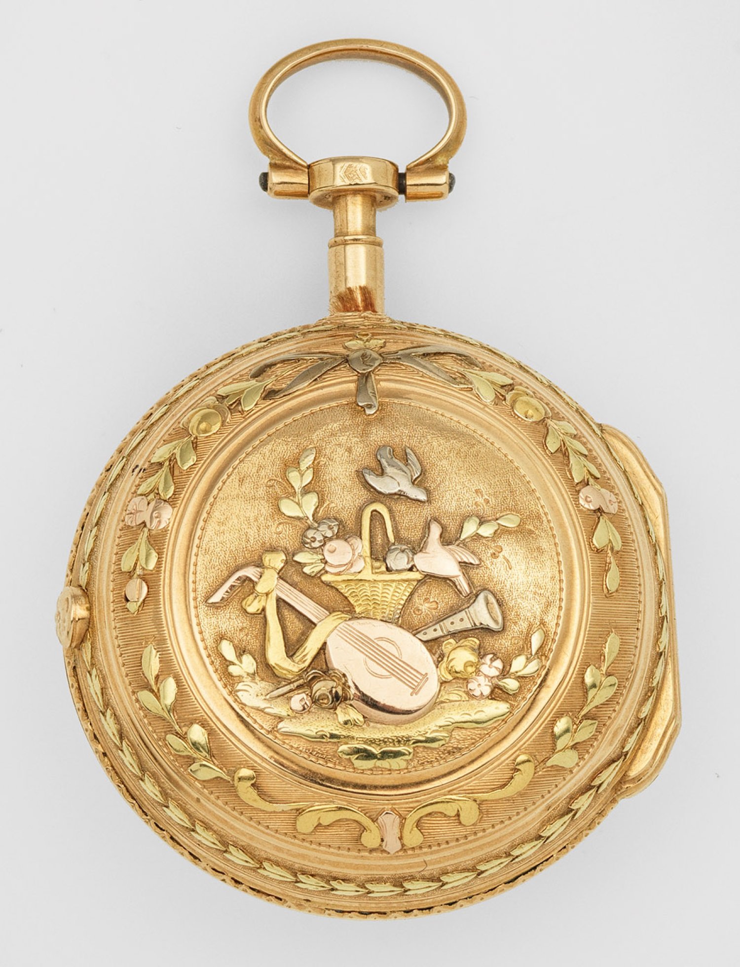 Schweiz. Genf. Um 1770. Gold, gest. mit Punze des Gehäusemachers JA. Das Übergehäuse in quatre couleurs, üppig dekoriert mit Zierbändern und Allegorie der Musik. Glattes Innengehäuse. Weißes, signiertes Emailzifferblatt mit römischen Stunden und arabischer Minuterie sowie "Louis VX"-Zeigern. Vergoldetes Vollplatinenwerk mit Kette und Schnecke, dreiarmiger Messingunruh und filigran dekorierte Unruhbrücke in Ajour. Platine sign. und num. 15991. Glas fehlend. Gew. ca. 48,30 g.; D. ca. 37 mm.