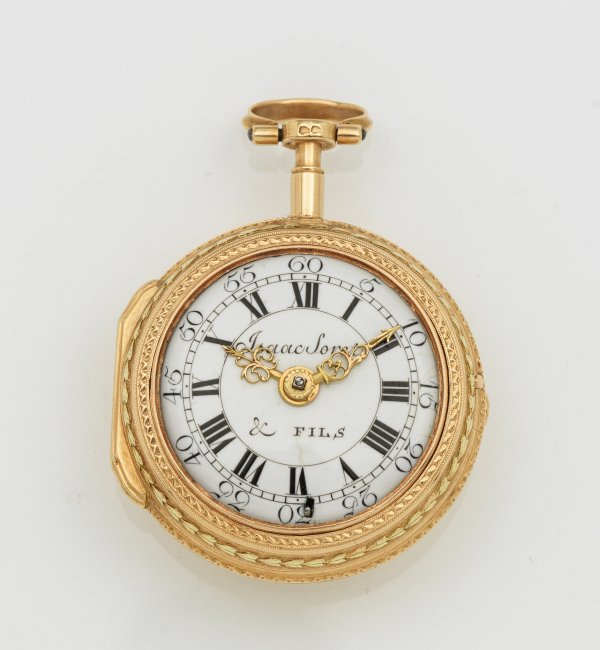 A pair-cased verge pocket watch by Isaac Soret & Fils, Geneva, circa 1770. Cases in gold. Gilt full plate movement with chain and fusee, signed and numbered 15991. Glass missing.