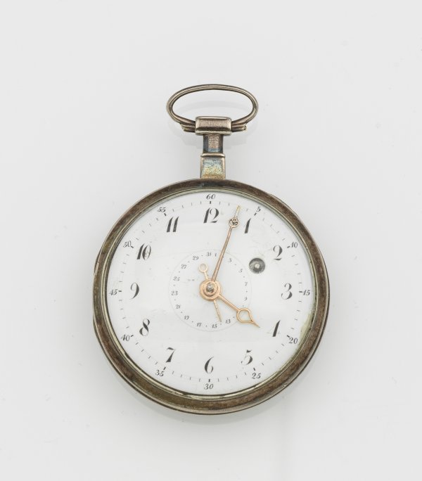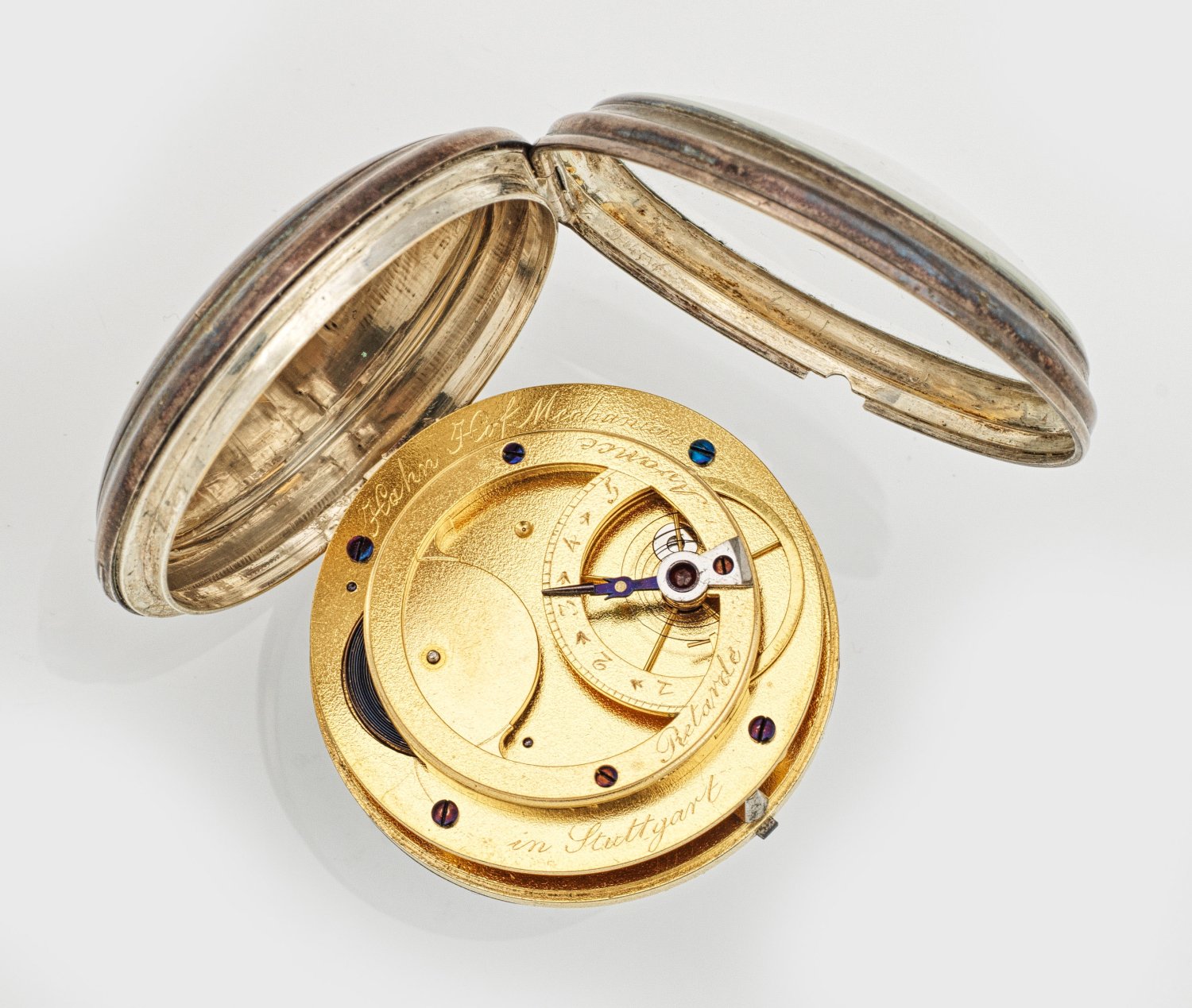 Deutschland. Stuttgart. Um 1800. Silber, gest. mit Punze des Gehäusemachers CFR und Nr. 2574. Glattes Gehäuse in offener Form. Weißes Emailzifferblatt mit arabischen Stunden und Minuten, unabhängiger, zentraler Sekunde und goldenen Zeigern in Ajour. Vergoldetes Vollplatinenwerk mit einem Federhaus, Schlüsselaufzug, Zylinderhemmung und fünfarmiger Messingunruh. Gew. ca. 112,42 g. D. ca. 53 mm.