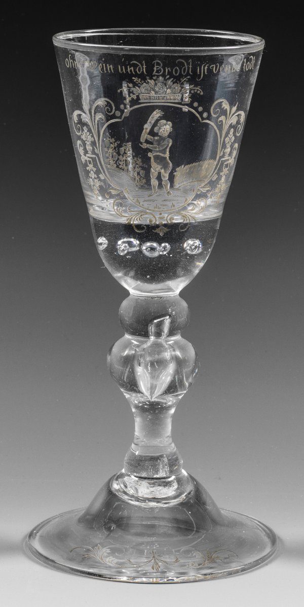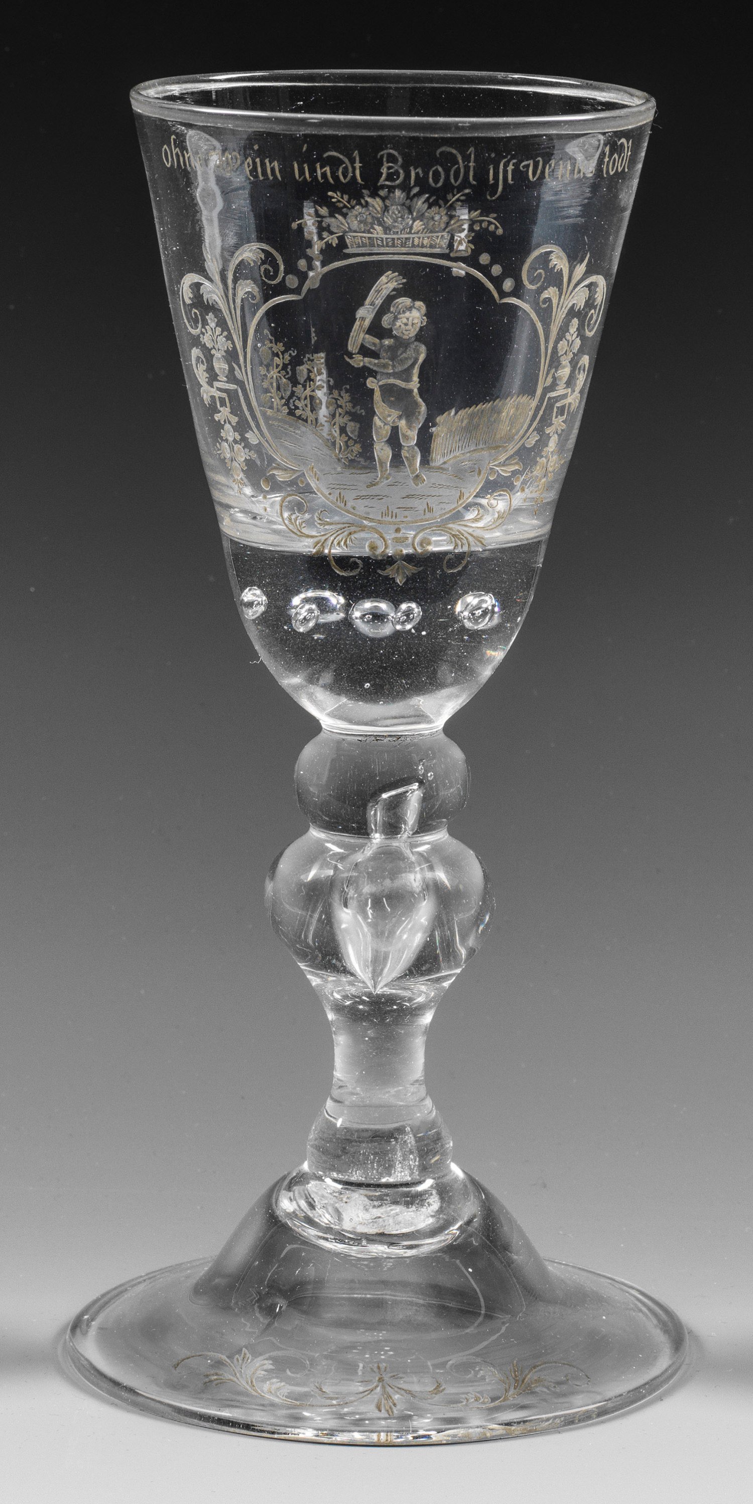 Farbloses Glas. Glockenfuß, Balusterschaft mit eingestochener Luftblase. Am massivem, ovoidem Ansatz durch sieben eingestochene Luftbläschen verzierte konische Kuppa. Auf der Wandung schauseitig in vierpassiger, von Blumen und Voluten umrahmter Kartusche Darstellung eines Amors am Rand eines Kornfeldes, darüber Sinnspruch "ohne Wein und Brodt ist venus todt". H. 23,2 cm.