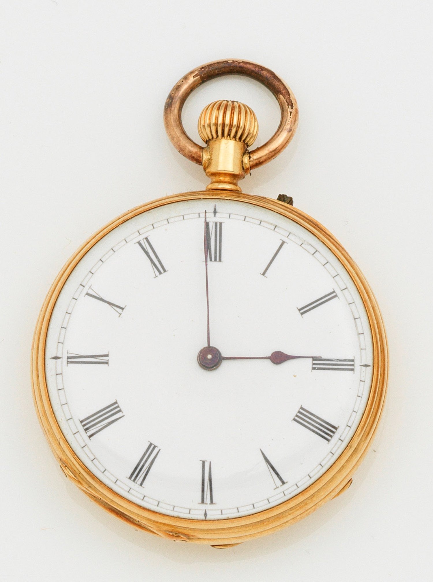 19. Jh.; Gelbgold, gest. 18 k. Offene Gehäuseform mit passiger Kartusche auf punziertem Grund. Gravierte Goldcuvette. Weißes Emailzifferblatt mit römischen Indices und schlanken, birnförmigen Zeigern. Brückenwerk mit Zylinderhemmung und Kronenaufzug. Nr. 11115. Gew. ca. 30 g. D. 33 mm.