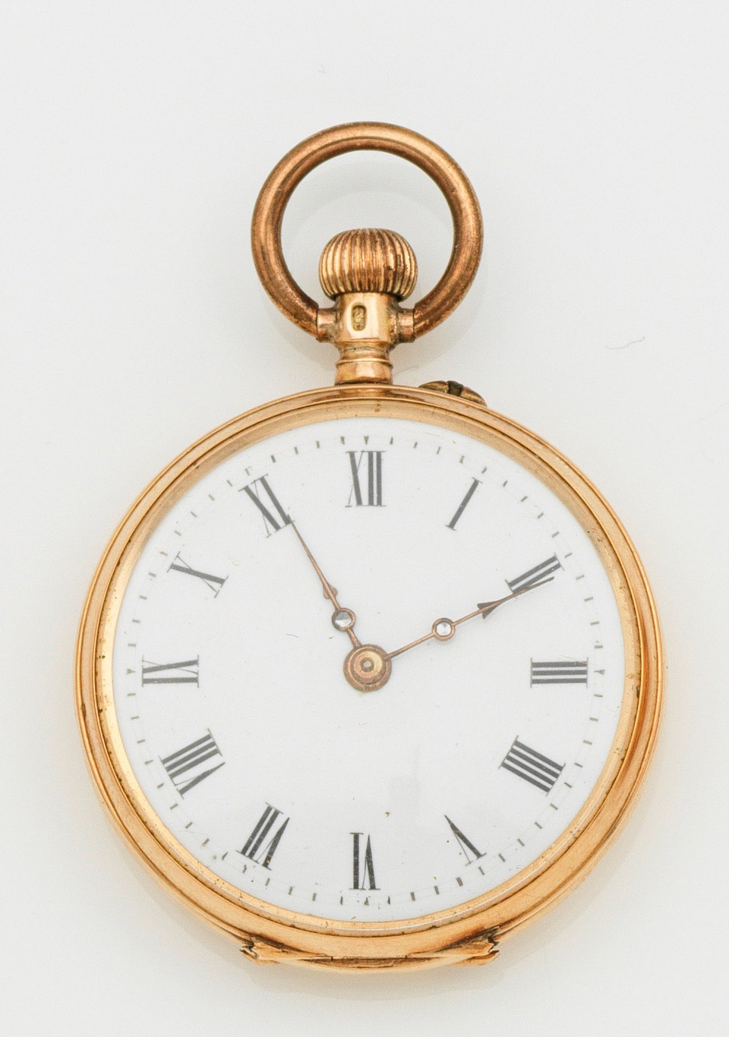 Schweiz, um 1900. Gelbgold, gest. 585. Offenes, teilguillochiertes Gehäuse mit gravierter Kartusche und vegetabiler Ornamentik. Vergoldete Kupfercuvette. Weißes Emailzifferblatt mit römischen Indices und pfeilförmigen Zeigern mit Markasitbesatz. Brückenwerk mit Zylinderhemmung und Kronenaufzug. Nr. 4114. Gew. ca. 22,26 g. D. 30 mm.
