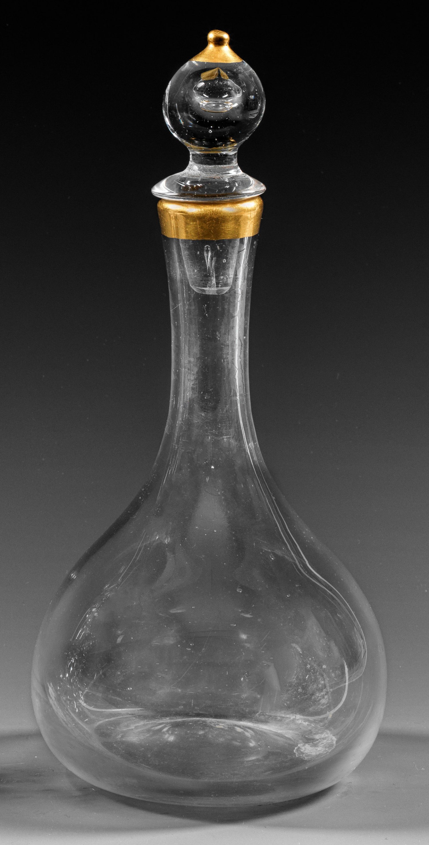 Tropfenform mit langem Enghals, ausgeschliffener Boden. In der Form korrespondierender Stöpsel mit eingestochener Luftblase. Goldgerändert. H. 24 cm.
