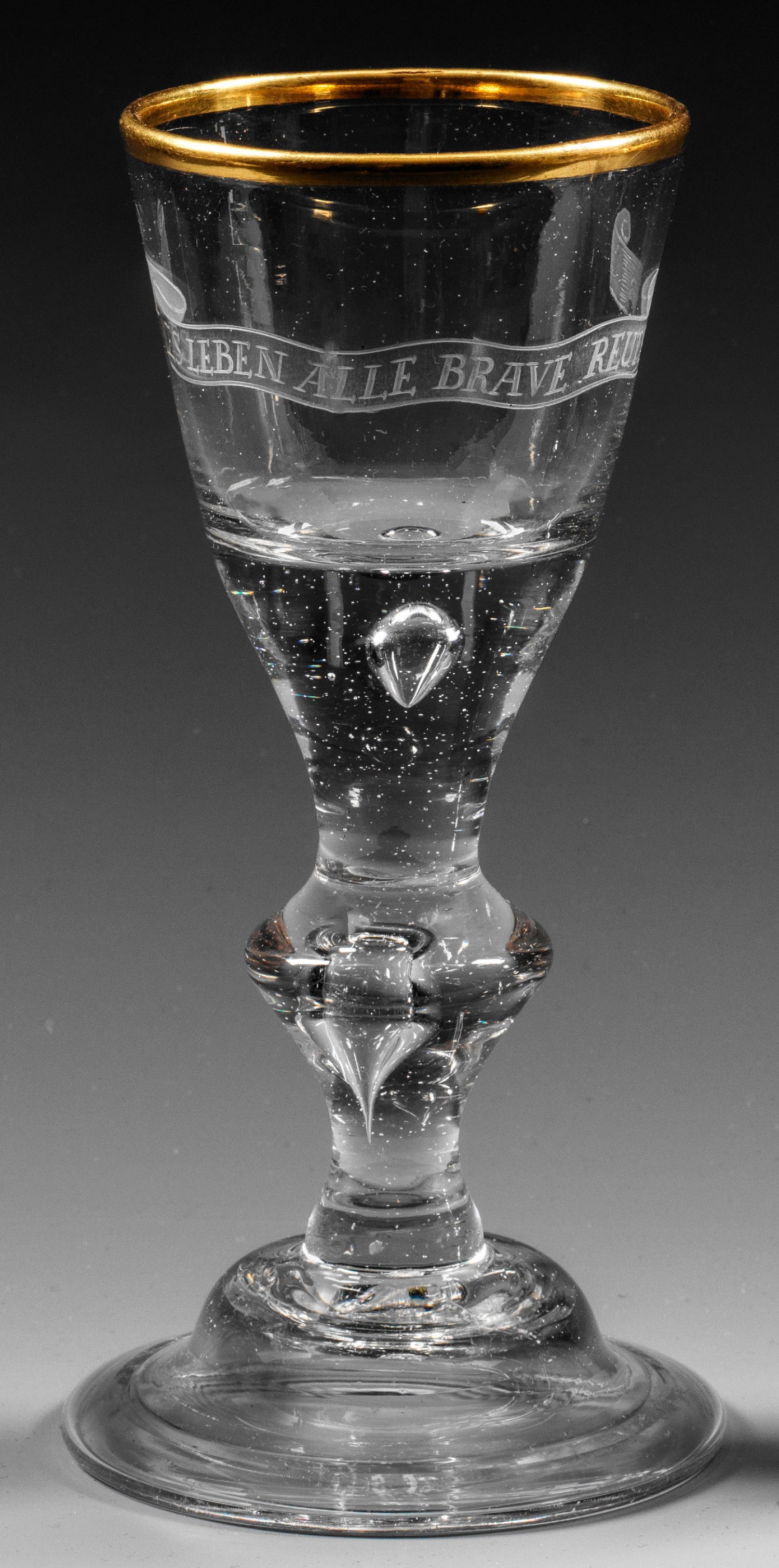 Farbloses Glas. Glockenfuß mit umgeschlagenem Rand, in Balusterschaft und Kuppaansatz je eine eingestochene Luftblase. Auf der Kuppa geschnittenes Spruchband mit Inschrift ''ES LEBEN ALLE BRAVE REUTER''. Vergoldeter Lippenrand. Im ausgeschliffenen Abriss geschnittene Löwenmarke. H. 18,2 cm.