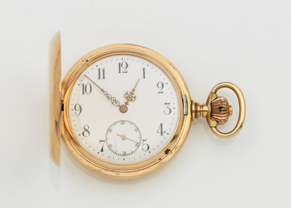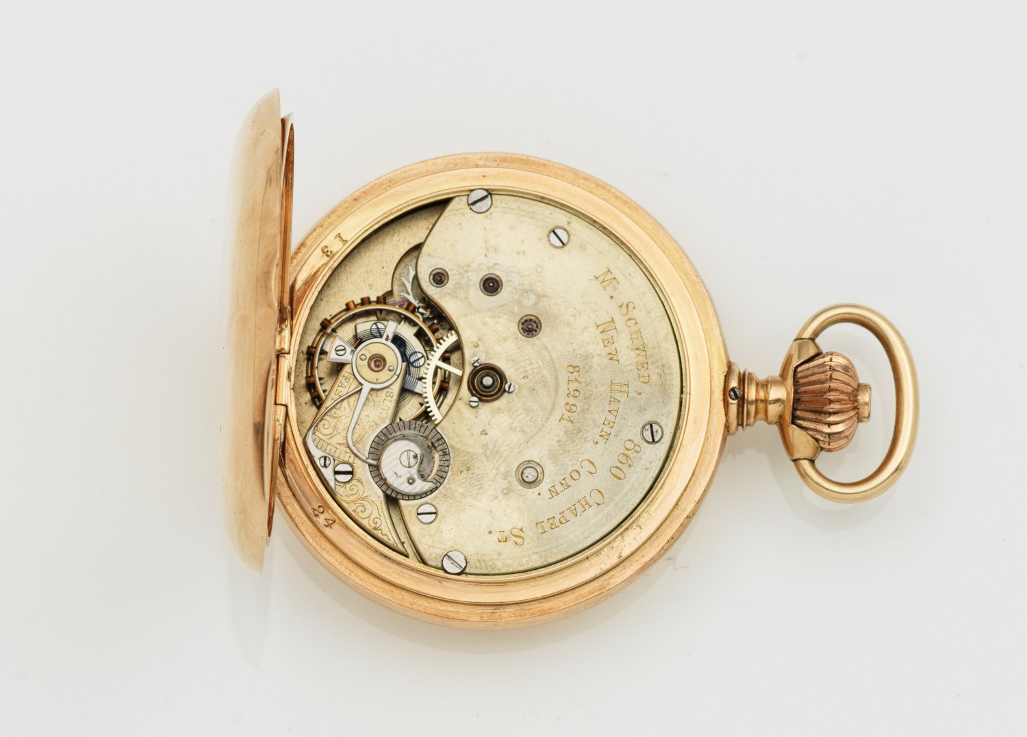 New Haven, Connecticut. Um 1910. Gelbgold, gest 585, Gehäusemacherpunze von Brooklyn Watch Case Co.; Glattes Savonettegehäuse. Goldcuvette. Weißes Emailzifferblatt mit arabischen Indices, kleiner Sekunde und vergoldeten Louis-XV-Zeigern. Teilplatinenwerk mit Kompensationsunruh, Ankerhemmung und Kronenaufzug. Platine bez. "M. Schwed [...] New Haven, Conn.". Werk-Nr. 81291, Gehäuse-Nr. 661324. Herstellerzeichen. Gew. ca. ca. 118,25 g. D. 52 mm.