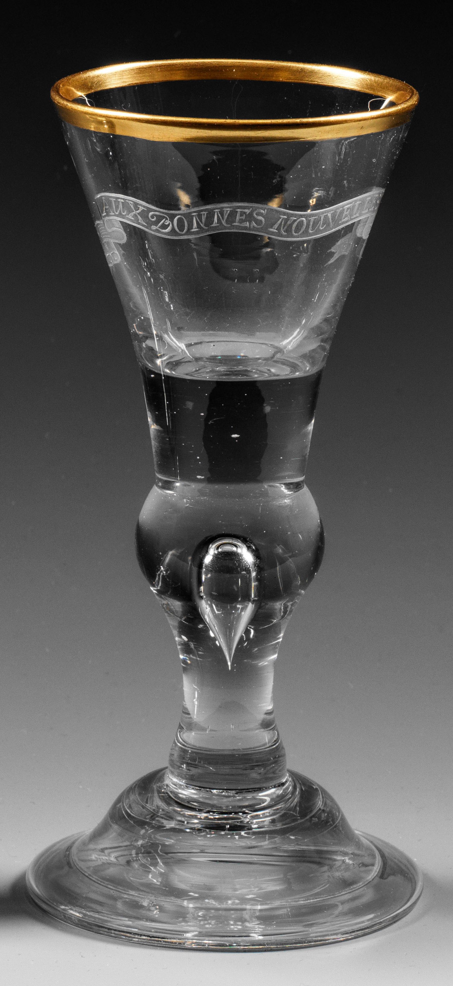 Farbloses Glas. Glockenfuß mit umgeschlagenem Rand, in Balusterschaft und Kuppaansatz je eine eingestochene Luftblase. Auf der Kuppa geschnittenes Spruchband mit Inschrift '''AUX BONNES NOUVELLES''. Vergoldeter Lippenrand. H. 18 cm.