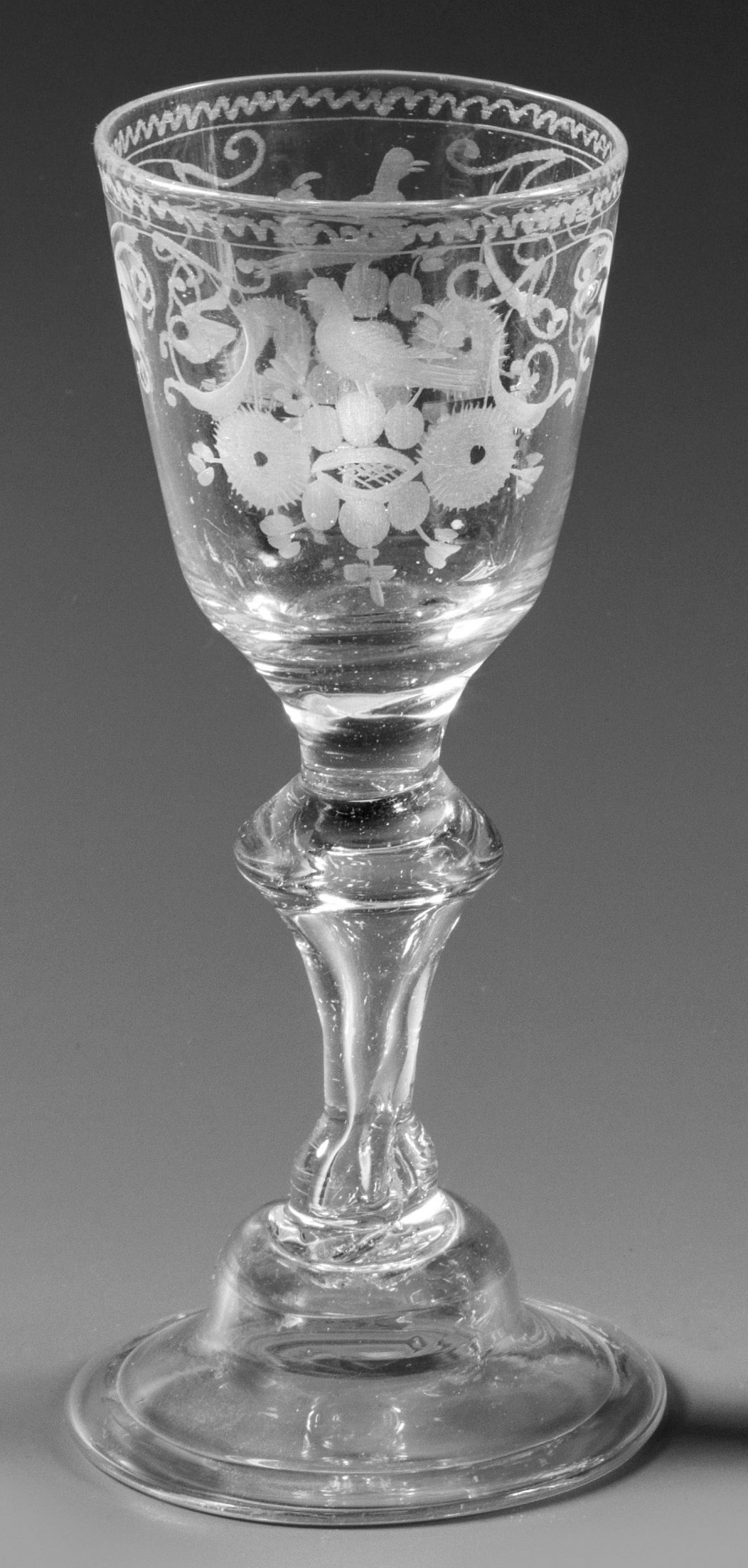 Glockenfuß, umgeschlagener Rand, im Balusterschaft eine große, eingestochene Luftblase. Auf der konischen Kuppa geschnittener Dekor aus Vögeln, Frucht- und Blumengehängen sowie Ranken. H. 15 cm.