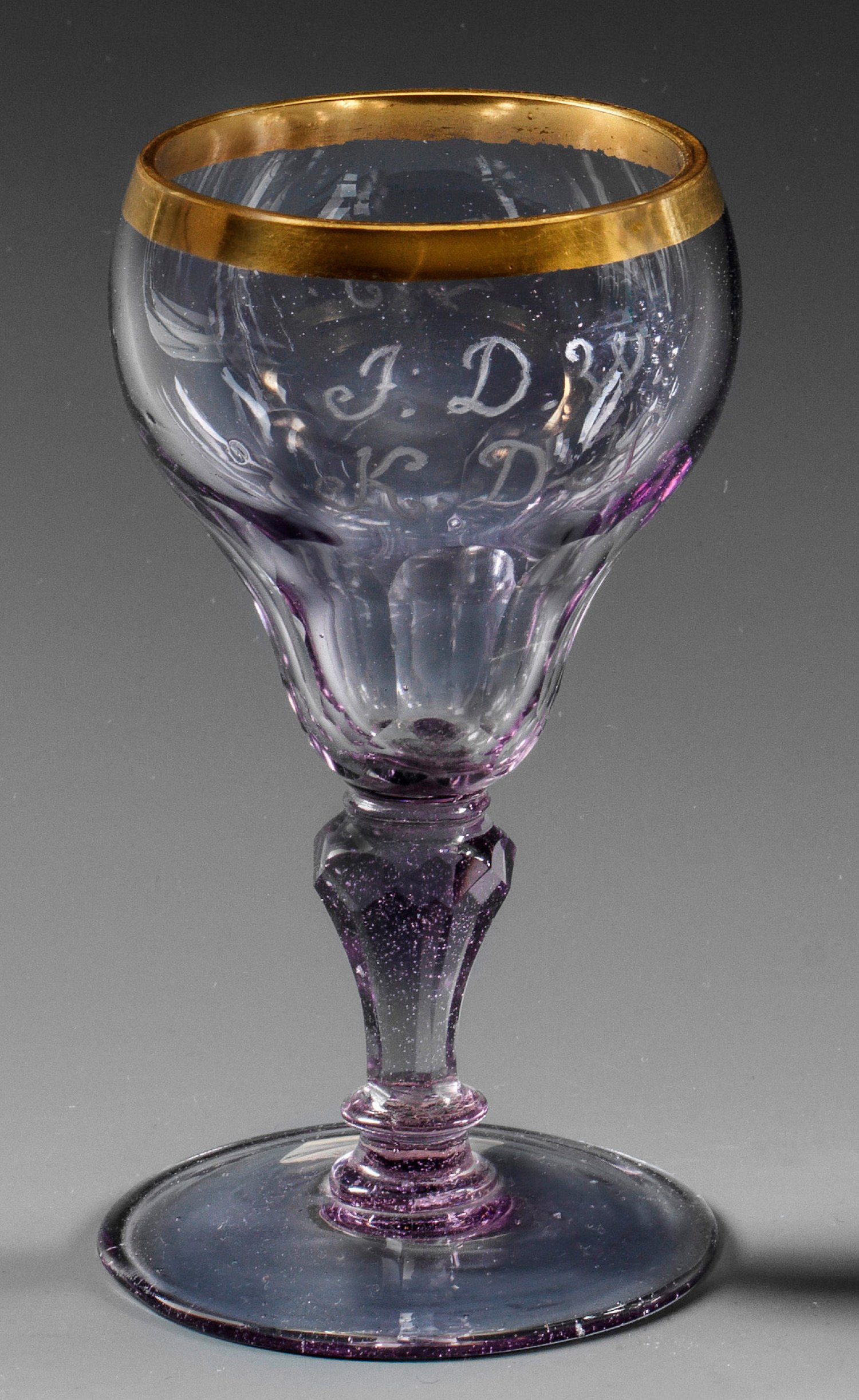 Manganviolettes Glas, partiell geschliffen. Balusterschaft und unterer Teil der glockenförmigen Kuppa facettiert. Vorder- und rücks. geschnittene Monogramme. Vergoldeter Lippenrand. H. 12,6 cm.