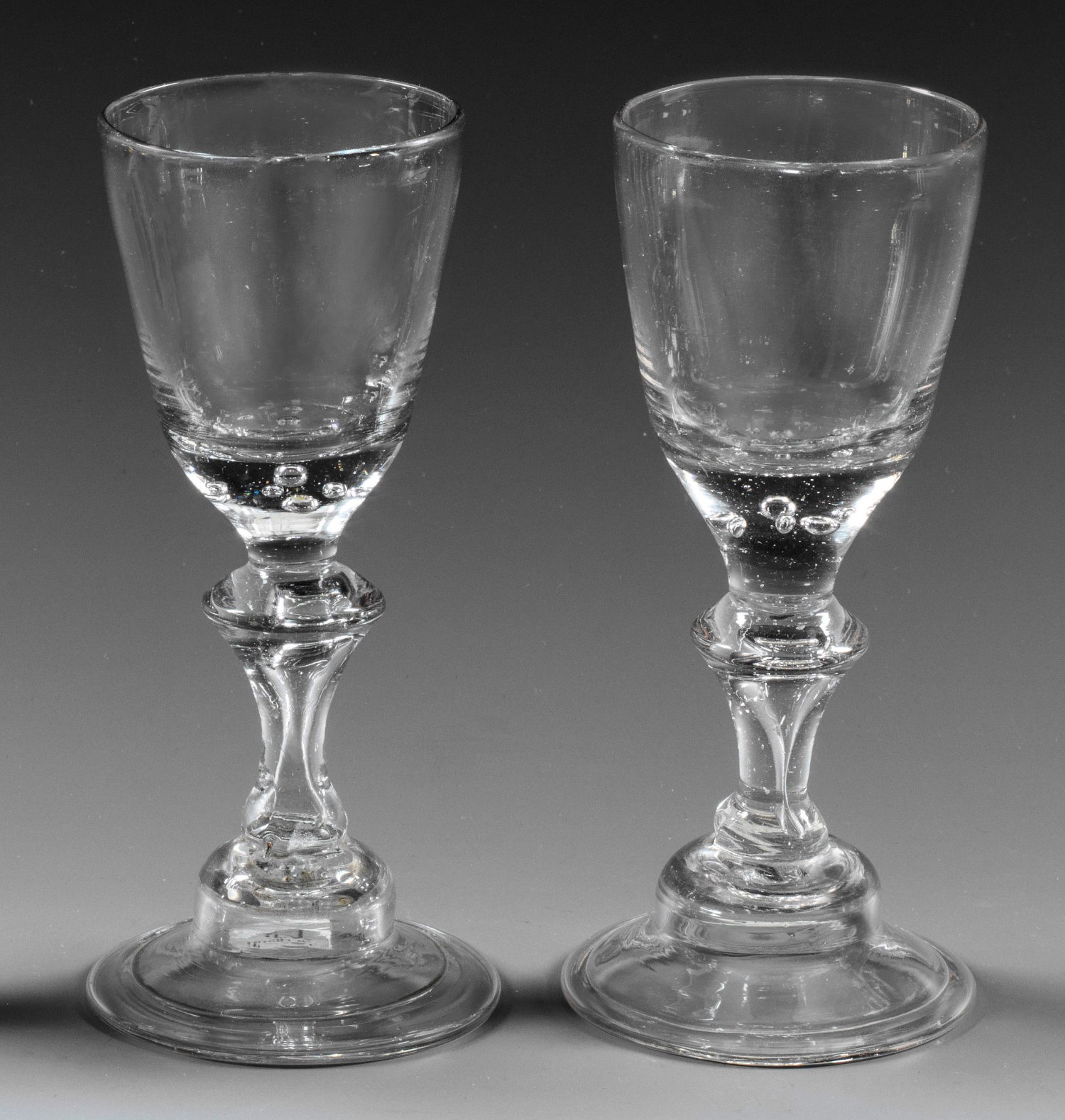 Glockenfuß, umgeschlagener Rand, im Balusterschaft eine große, eingestochene Luftblase, im Ansatz der konischen Kuppa sieben kleine Luftblasen. H. 15,2 cm.