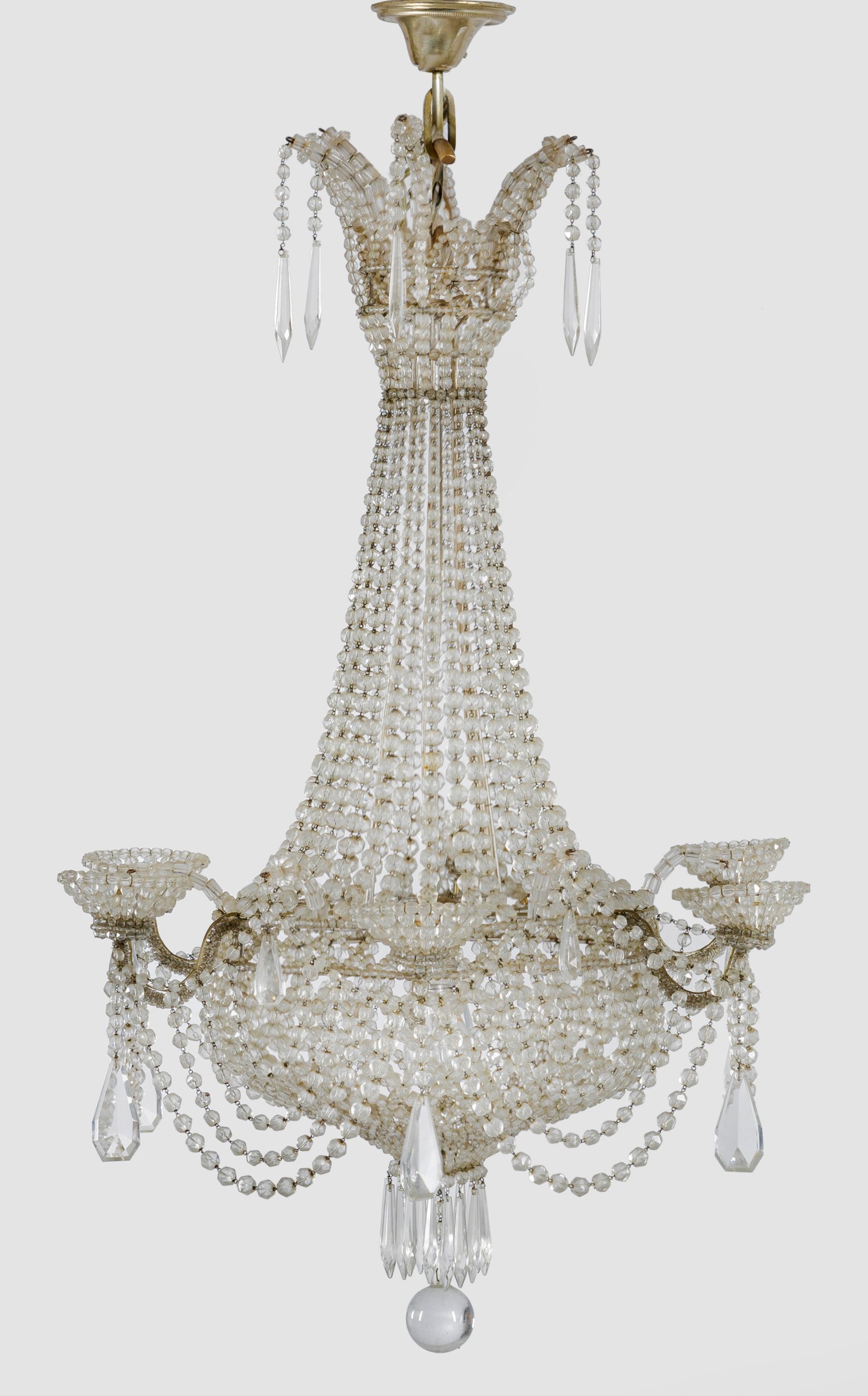 6-flg.; Farbloses Glas. Balusterförmiger, durchbrochen gearbeiteter Korpus aus teilw. gitterartig angelegten Prismenschmüren im Verlauf als Träger für schmale Leuchterarme und korbförmige Lampenschalen. Reicher Behang aus Prismenschnüren und facettierten Prismen. Elektrifiziert. H. 110 cm. D. 60 cm.