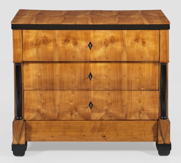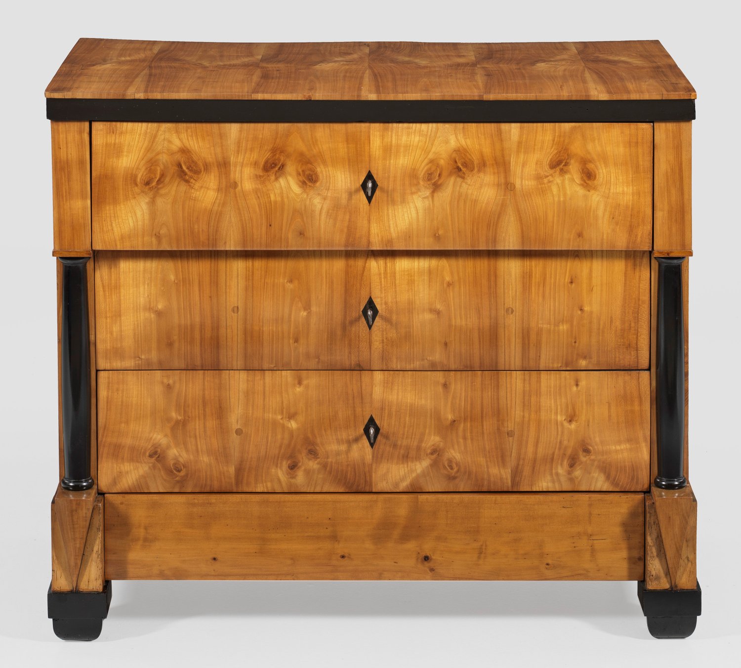 Kirschbaum, furniert sowie teilw. ebonisiert. Gerader, querrechteckig angelegter Korpus, flankiert von eingestellten Halbsäulen auf einschübigem Zargenkasten und kräftigen Füßen. In der gegliederten Front drei breite, teilw. vorkragende Schubladen. Gering überstehende Deckplatte. H. 89 cm. 102 cm x 52 cm.