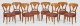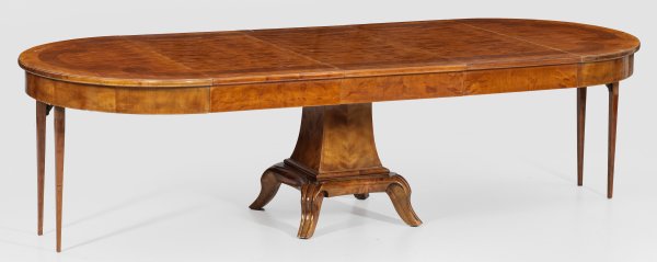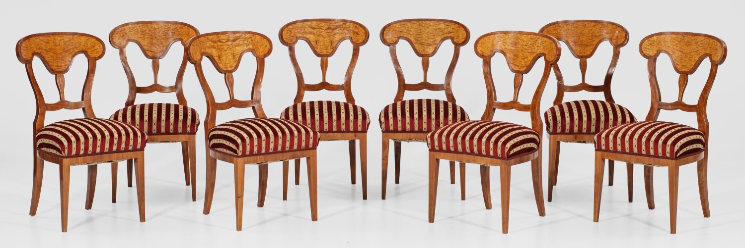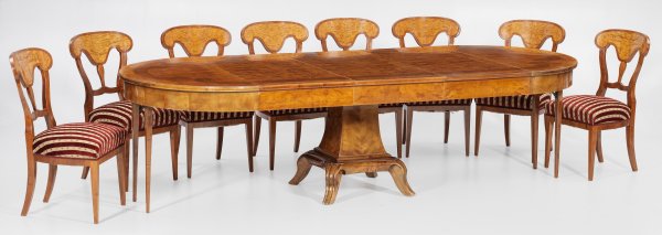 9-tlg.; Großer Ausziehtisch und acht Stühle. Birkenholz und Kirschbaum, furniert. Über konkav eingezogenem Sockel mit Volutenfüßen kräftiger, gekanteter und sich konisch verjüngender Schaft als Träger für bombierte Zarge. Vier Einlegeplatten. Trapezförmige Zarge auf konischen Vierkantbeinen sowie gewölbte Rückenlehnenrahmung mit breitem oberen Abschluss. Sitzfläche gepolstert und bezogen. Tisch-H. 77 cm. 119 cm x 119/343 cm. Sitz-H. 48 cm.