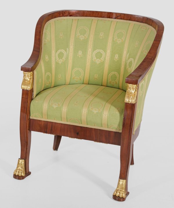 Mahagoni, furniert sowie teilw. geschnitzt, gefasst und vergoldet. Hufeisenförmige Zarge auf leicht geschwungenen Beinen mit reliefplastischen Tatzenfüßen, in entsprechende Strebe mit Löwenkaryatide übergehend. Geschweift ansteigende Armlehnen sowie stark gewölbte Rückenlehnenrahmung. Allseitig gepolstert und bezogen. H. 87 cm. 69 cm x 55 cm. Sitz-H. 47 cm.