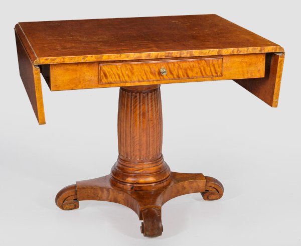 Birkenholz, furniert. Gerader, einschübiger Zargenkasten auf kräftigem, kanneliertem Säulenschaft sowie konkav eingezogener Sockelplatte mit Volutenenden. Rechteckige, an den Kurzseiten aufstellbare Deckplatte. H. 75,5 cm. 96/136 cm x 74 cm.