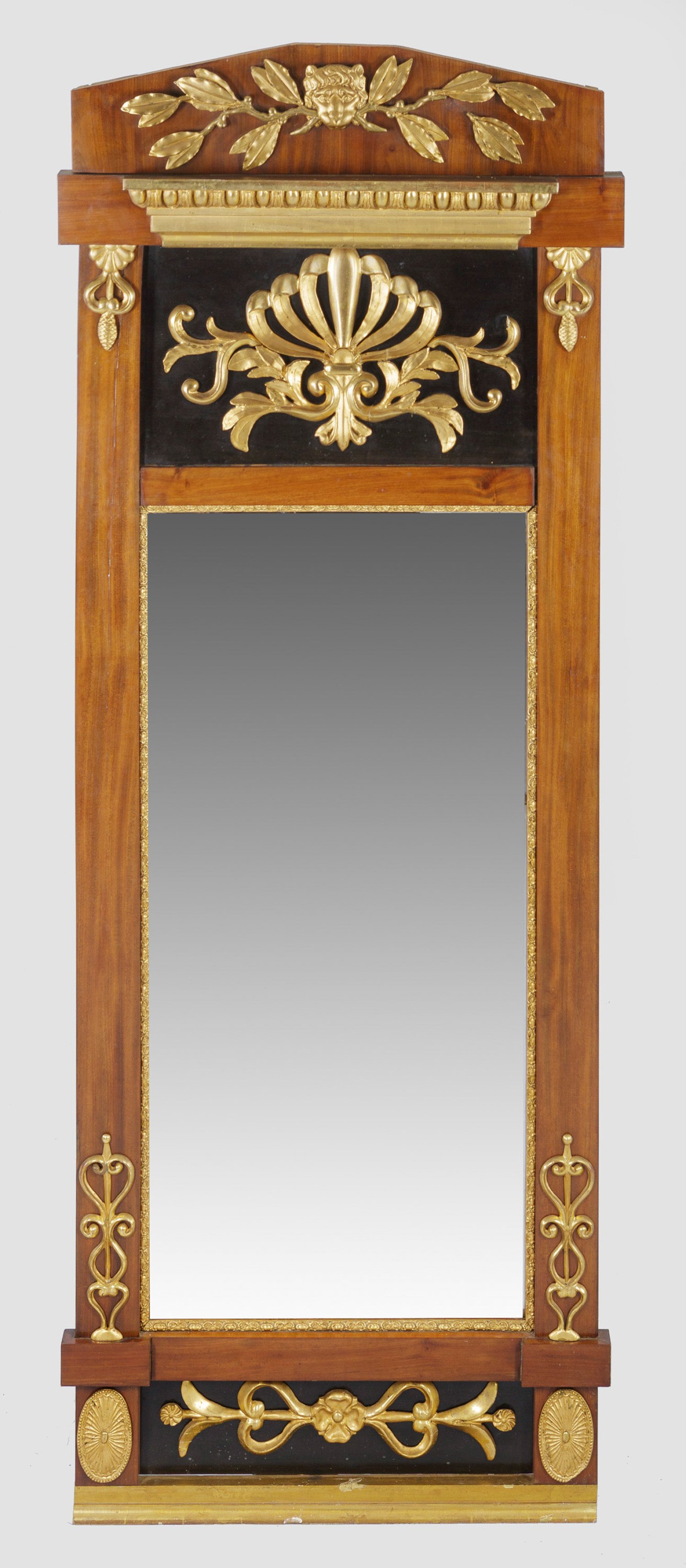 Mahagoni, furniert bzw. teilw. ebonisiert sowie Holz, stuckiert und vergoldet. Gerade, hochrechteckige Spiegelrahmung. Im breitem Giebelfeld appliziertes Fächermotiv mit Blattwerk. Oberhalb vorkragendes Gesims mit Eierstabfries sowie oberer Abschluss mit Löwenmaskaron. Zweigeteiltes Spiegelglas. 210 cm x 80 cm.