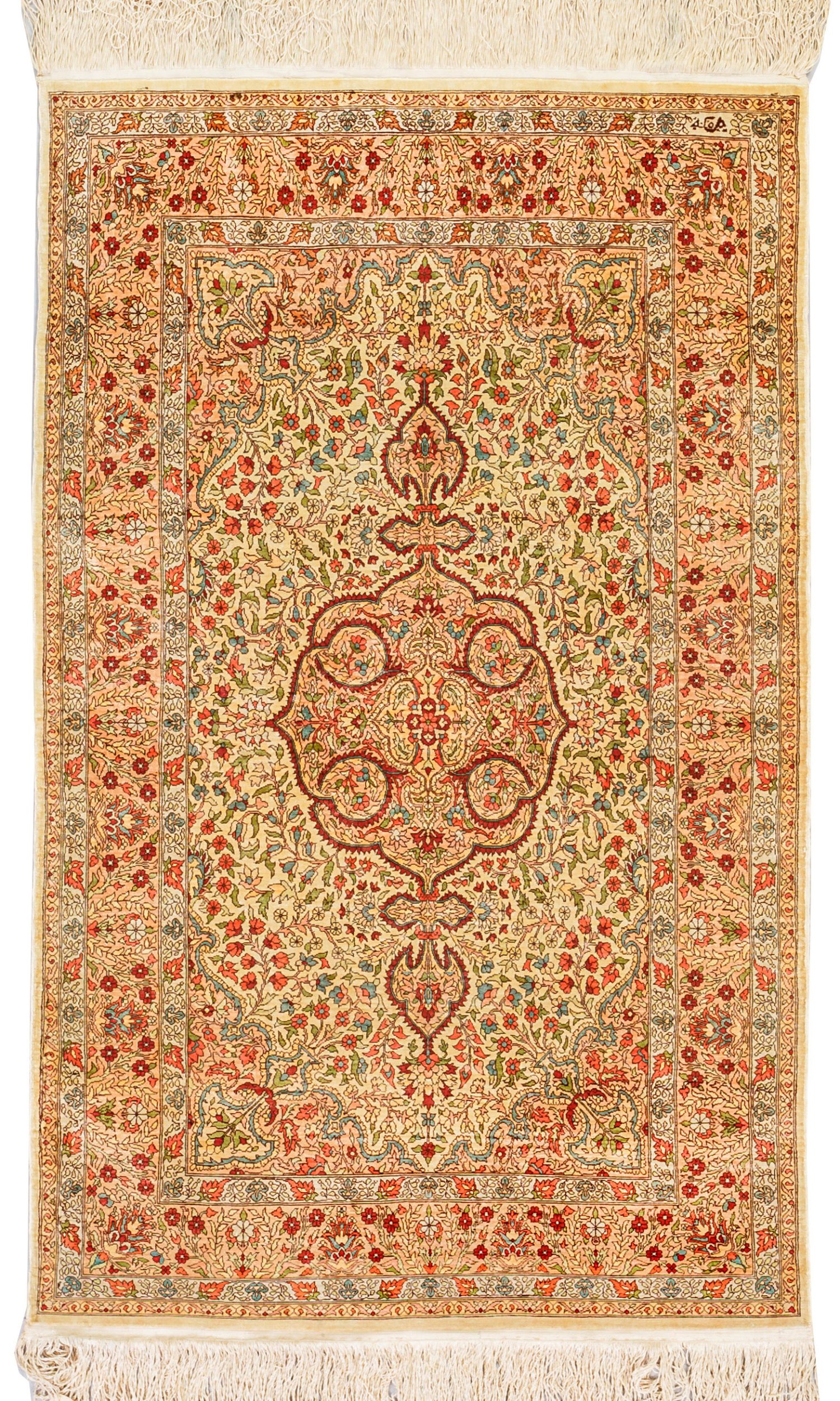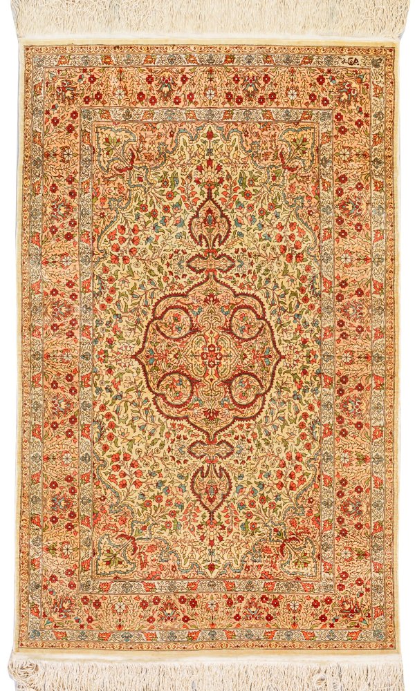 Türkei. Seide auf Seide. Sehr feine Knüpfung. Im cremefarbenen Innenfeld großes, kartuschenförmiges Zentralmedaillon mit Anhängern, passig geschweifte, roséfarbene Ecklösungen sowie flächendeckend dichte Musterung aus Blütenrispen. Umlaufend breite, korrespondierende Bordüre, flankiert von schmalen Blütenbändern. Sign.; 82 cm x 136 cm.