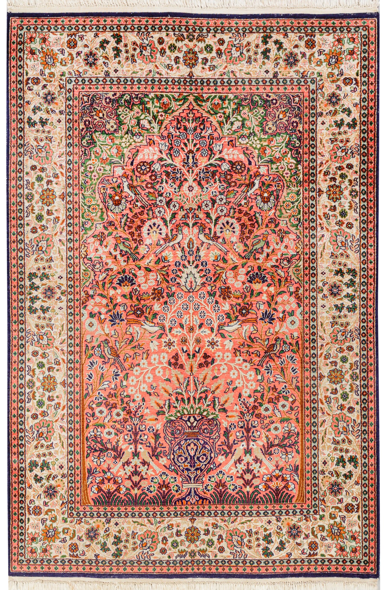 Indien. Seide auf Baumwolle. Auf lachsfarbenem Fond passig geschweifte Nische mit großem Vasenmotiv sowie flächendeckend dichte Musterung aus Blütenranken und Vögeln. Umlaufend breite, elfenbeinfarbene Blütenbordüre. 185 cm x 125 cm.