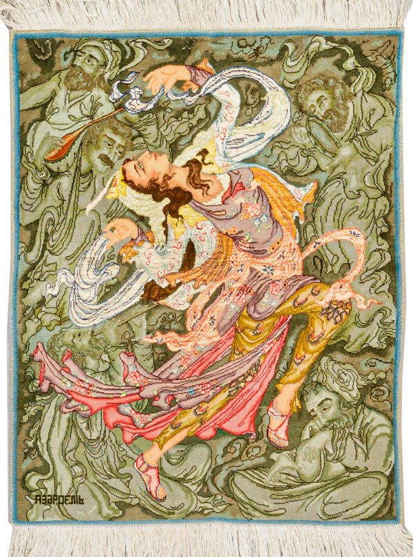 Persien. Korkwolle mit Seide auf Baumwolle. Feine Knüpfung. Flächendeckende Darstellung Scheherazades, eine der Hauptfiguren aus der Rahmenhandlung der persischen Geschichten von Tausendundeiner Nacht, umgeben von schemenhaften Gestalten aus ihren Erzählungen. 64 cm x 80 cm.