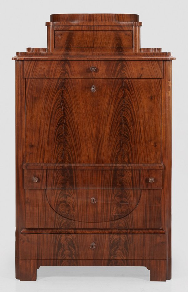 A North German mahogany and maplewood veneered Biedermeier writing cabinet.